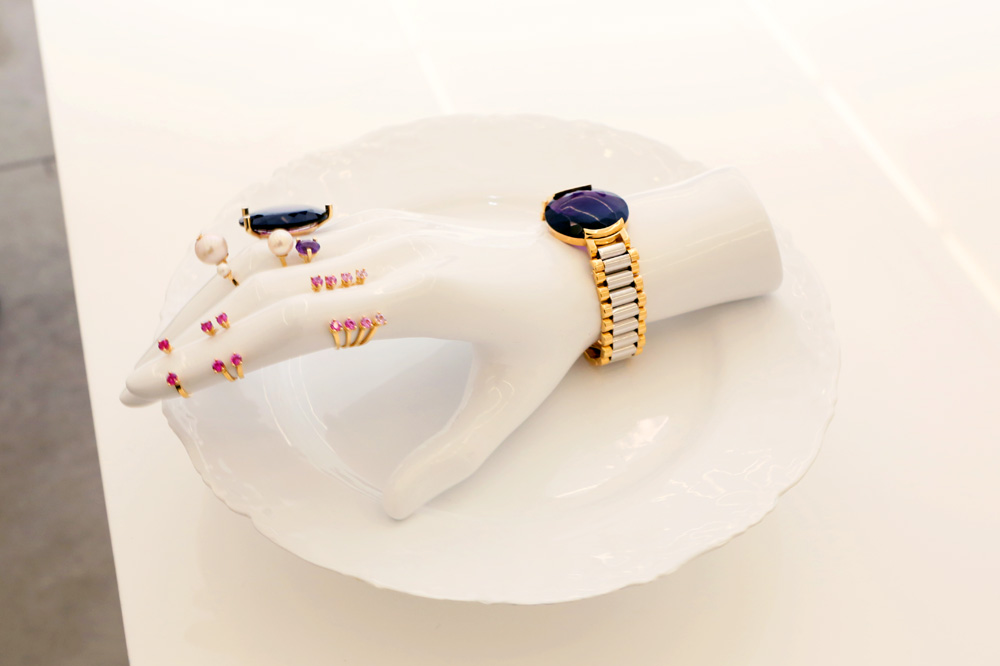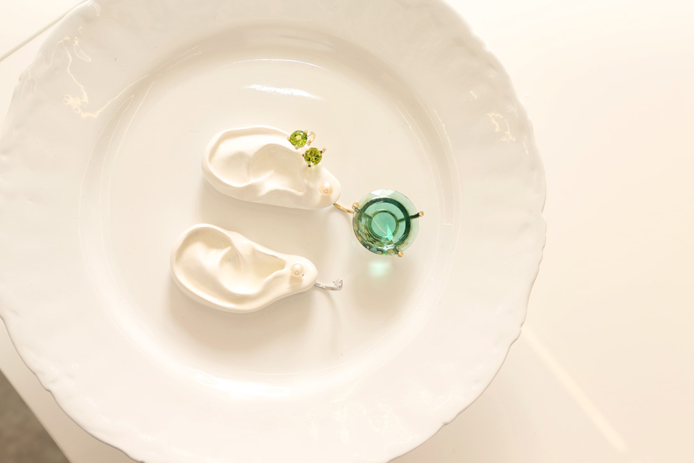 “For this collection, I wanted the color of the stones, like quartz and peridot, to really pop out. You are attracted to jewelry the same way you’re attracted to food, right? And I tried to find a way to making even the stones seem to float on the body, using phantom settings to give the effect of levitation. I’m curious, so I’m always looking for the strangest way to look at jewelry. The plates that the jewelry are displayed on are levitating. We used magnets! I just did research like a nerd on my laptop to figure out how. I didn't learn it from science class—I was the worst at school. [Laughs]
