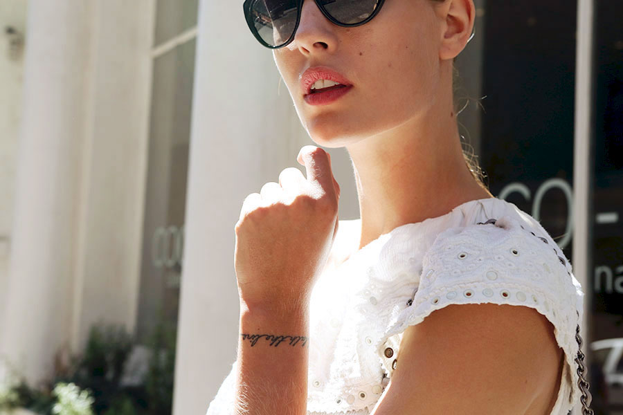 Leaving the Jason Wu Spring 2014 show on a high of metallic slip dresses, safari suits, “romantic” glitter eyes, and “expensive” hair, we nearly stumbled into model Nadja Bender, who was, as usual, dressed impeccably. And her single-shoulder eyelet top revealed the self-confessed shopaholic’s latest acquisition: new tattoos. Three to be exact, down the back of her forearm, on her inner wrist, and a very Freja-esque round-the-wrist bracelet in what looked like someone's handwriting.