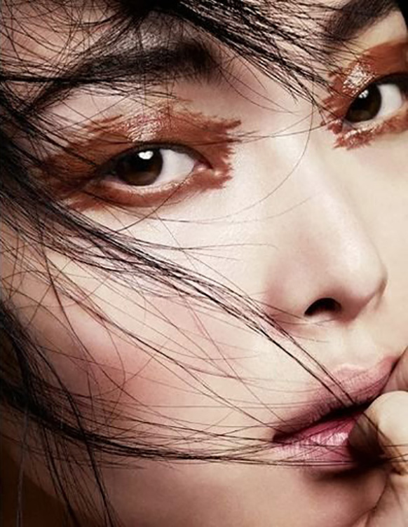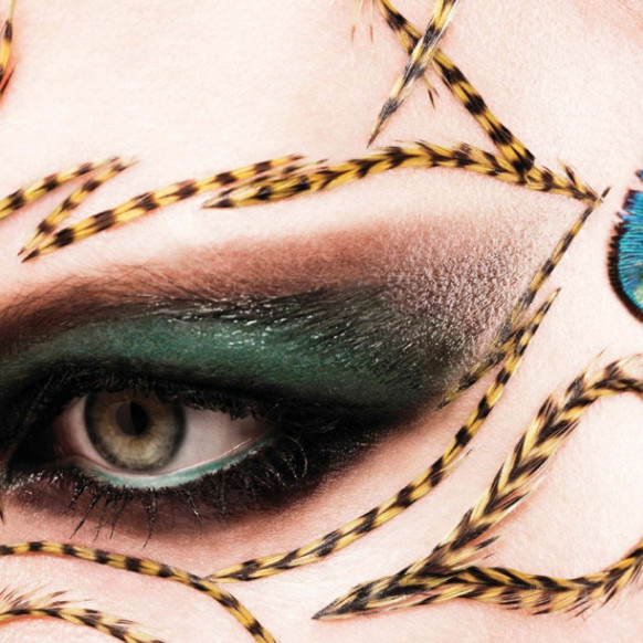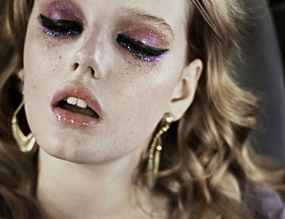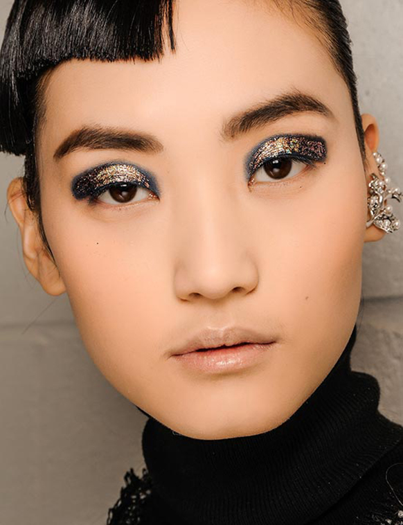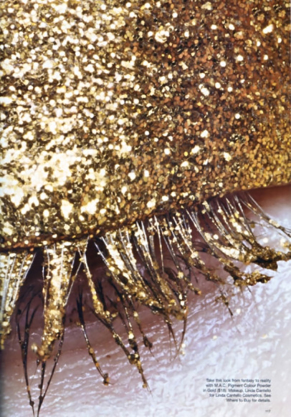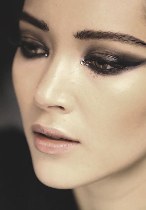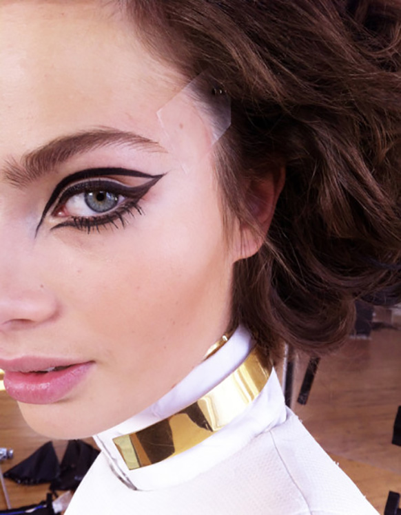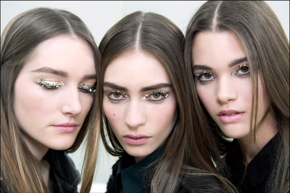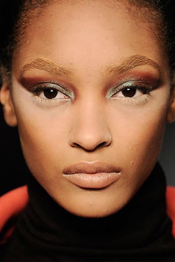 Pat McGrath: “These eyebrows are like jewelry. Working with the natural brow shapes, we applied glue, gold pigment, and gold glitter in many layers to create a brocade texture. It’s a real build. To get it right, we just painted on the pigment and wiped it away. We were really having fun. The glue was used to ensure that the gold stayed for the full show. And we decided on gold because it feels both organic and futuristic.” [Dior Spring 2014]