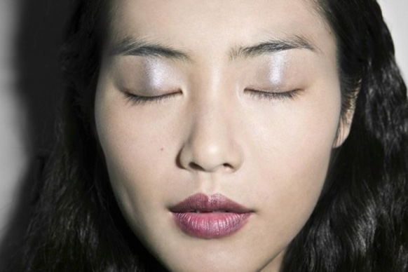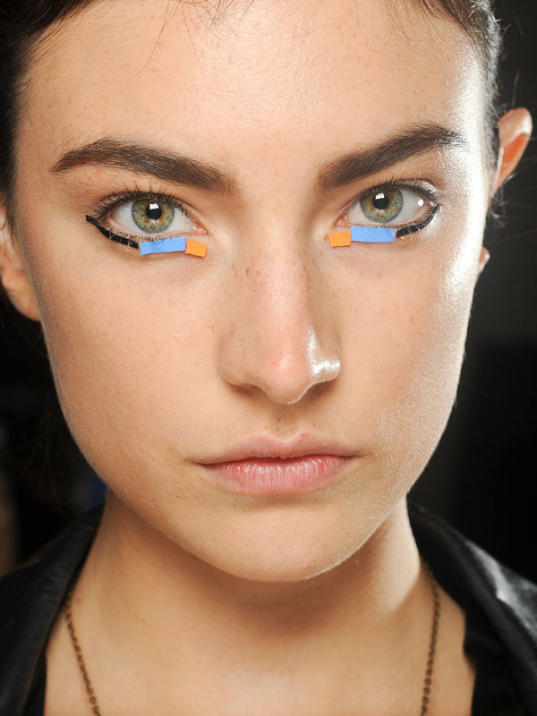Tom Pecheux: “I just came back from Marfa, Texas where I saw Donald Judd’s work and was totally inspired by the cube, because it’s so simple yet very powerful. So, like a cat eye, we put the cube on the outer corner of the girls’ eyes, using an Estée Lauder eye pencil to outline the shape and then, with a square brush, filling it in with a cream shadow. You want to 'tilt' the shape, but not too much, to keep it graphic and contemporary, and to avoid being retro. We didn’t use mascara to, again, keep it very minimal… And we put a nude, slightly glossy color on the lids to make them look ‘humid.’ For me, this is a great look that a woman could build during the day, rather than just adding a lip for night. You can wake up, go to work, and, without having to go home and change, add this eye and go out for dinner, drinks, and who knows what afterward.” [Derek Lam Spring 2014]