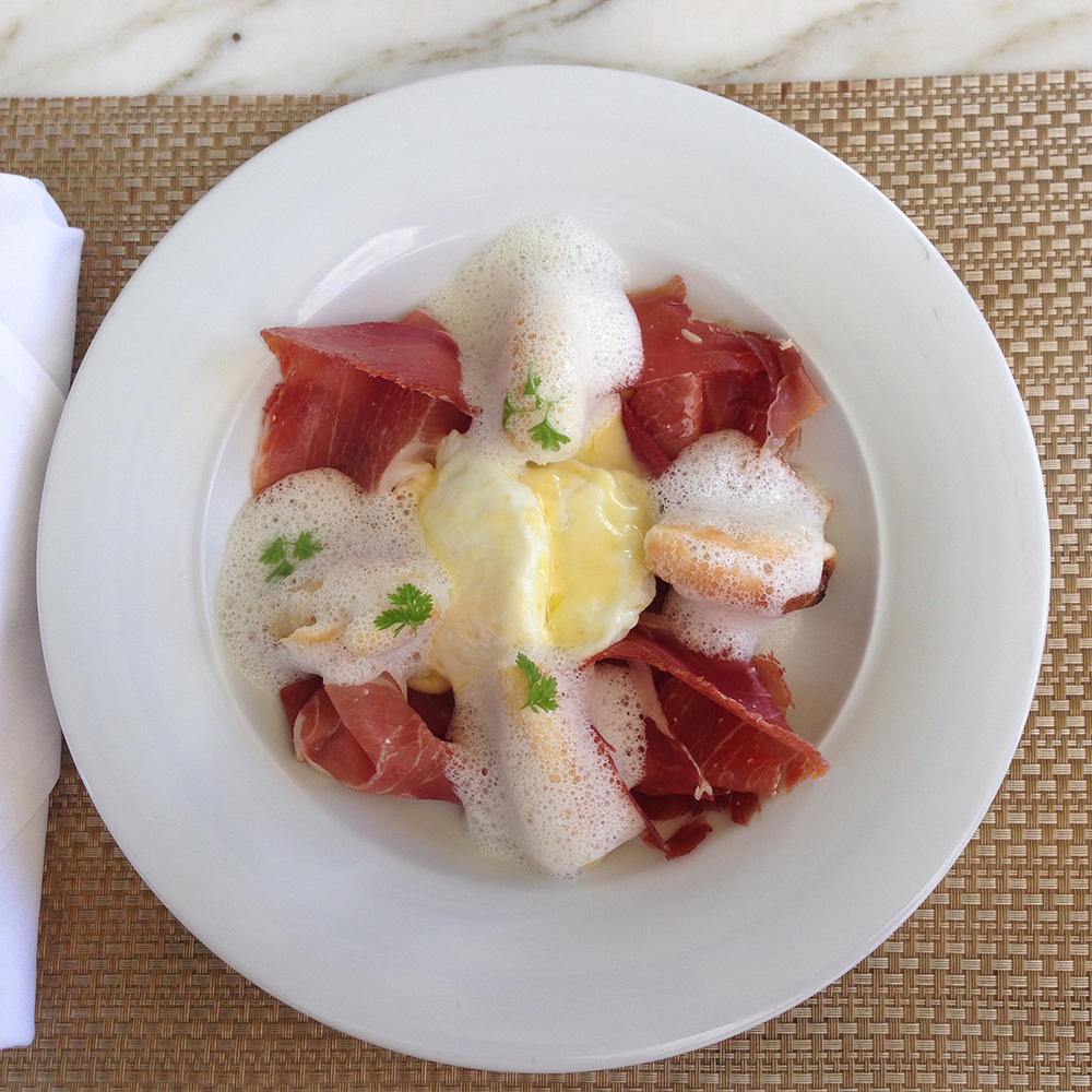 Don't get me wrong—normally I snicker at food with foam on it—but this Eggs Benedict with jamón serrano was the best hangover cure I could have asked for—right at our hotel [6].