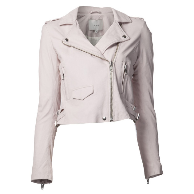 IRO Pink Distressed Suede Adila Biker Jacket : Winter requires heavily plied wool, so until spring rears its beautiful face, I'll let this close-to-the-skin, nearly nude, suede biker peek out from under more weather-appropriate pieces.