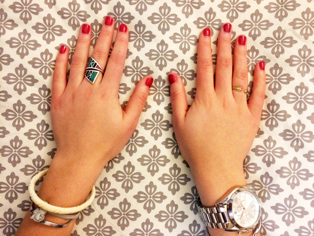 In honor of this Saint Valentine fellow, the Gloffice threw a red nail party. Each of us brought in our favorite crimson polish and celebrated our shared love of friendship, readily-available drugstore candy, and acetone fumes (beauty editors actually love the smell of polish remover). Our top reds (in no particular order) are below; share yours with in the comments!