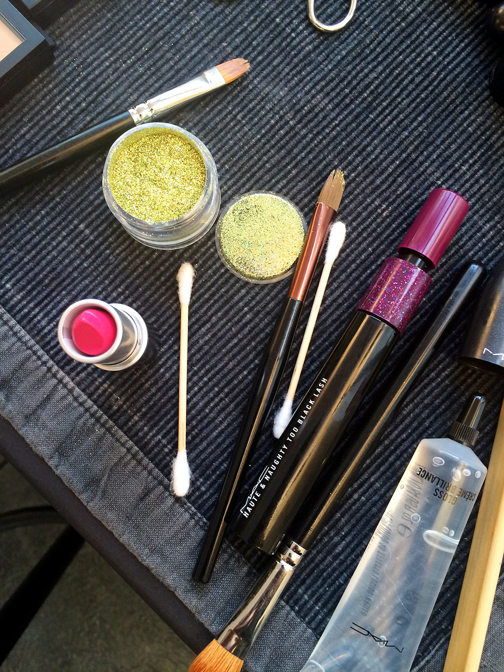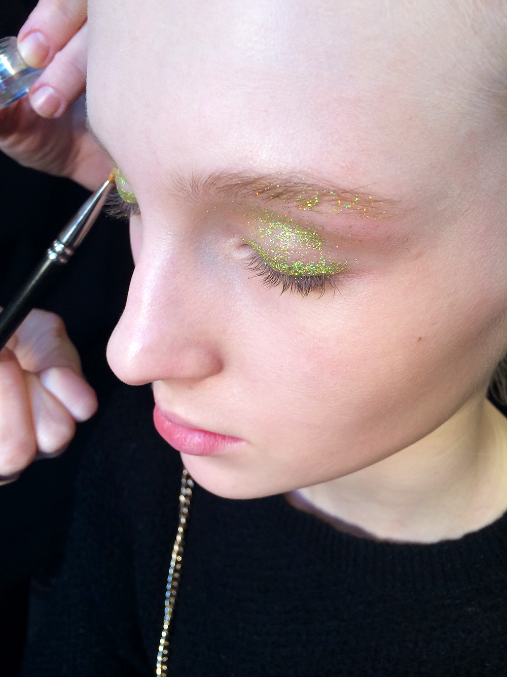 One model seemed leery, noting that it was her last show of the day, and that the billion-fleck removal process would fall to her and not the next show's makeup artist. The glitter would of course fall all over her cheeks, into her mouth, onto her shirt, and on the floor of her apartment, where it would live 'til eternity (glitter can neither be created nor destroyed, right?).