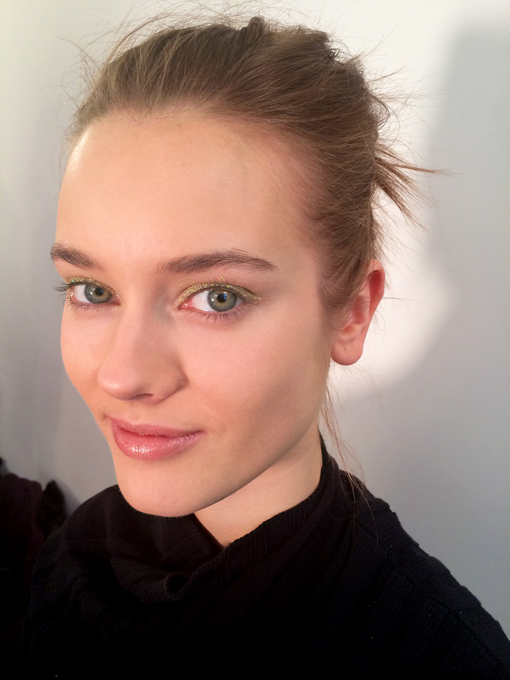 Tom Pecheux decided his original eye makeup idea for Altuzarra's fall line—a duo-color look inspired by the primary knits in the collection—looked nice, and very pretty, but was, “so bloody boring.” So, he reached for a pot of MAC Glitter (in Brass Gold, which will be released this fall) and dabbed it onto the models' lids instead, affixed with a layer of gloss.