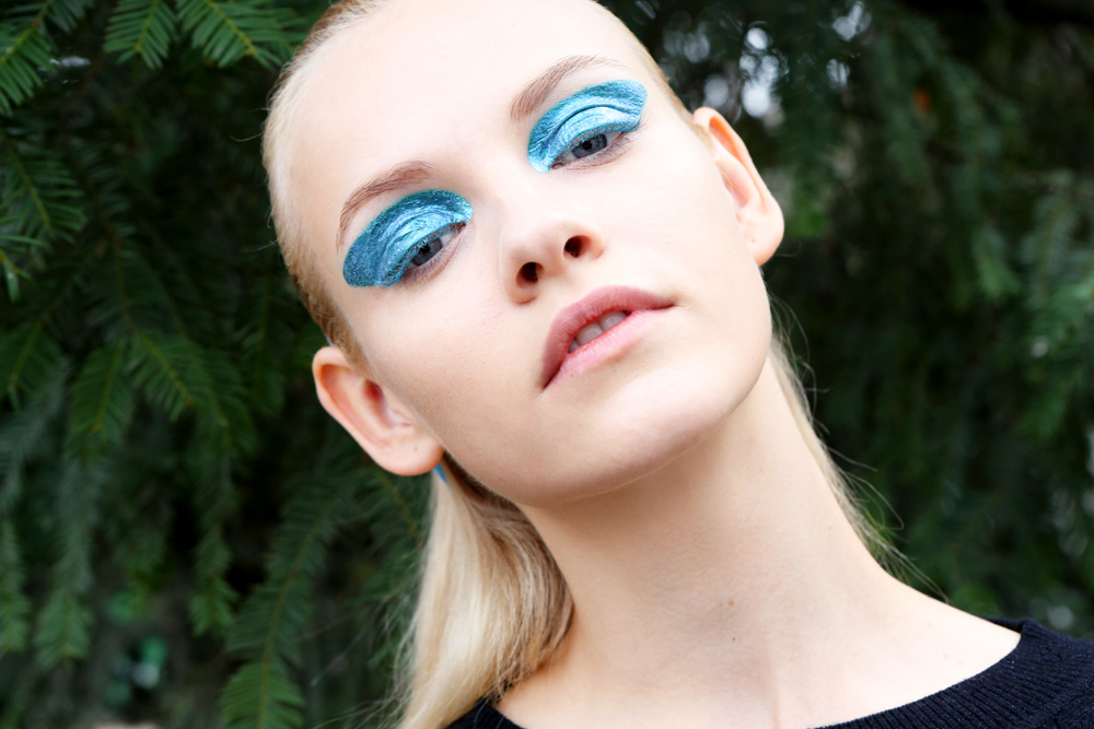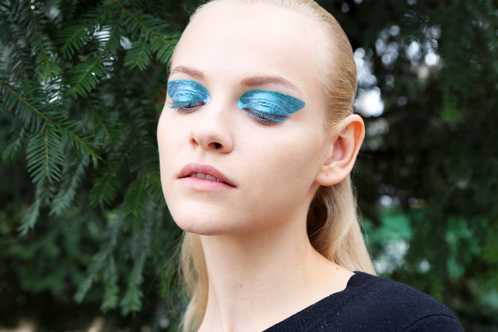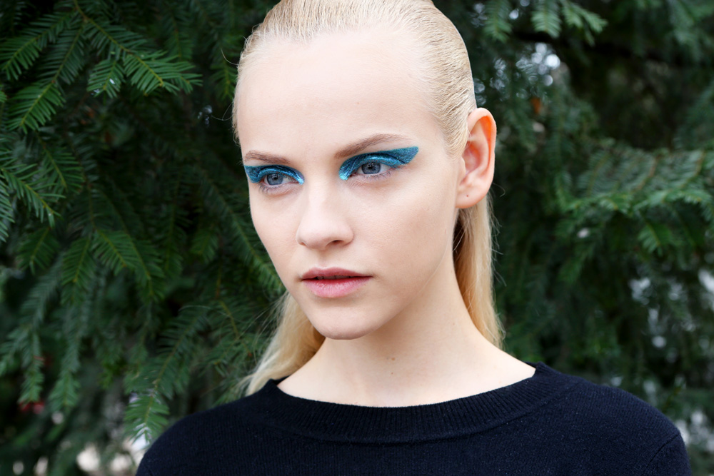 Pat McGrath: “Here we have this woman who's slightly masculine, very streamlined, and ultra, ultra, ultra urban. When you do a mouth, it's always quite feminine, so it just felt right to play with the eyes. We wanted to move away from that wing shape, though, and do something tough, strong, and very graphic. It’s actual latex—yes, latex paint. We did the shape freehand with a pencil, no stencils, and painted the latex over it. Then we wait for it to dry, but it can’t be too dry because we then push the blue, slightly lavender glitter into it. The latex gradually swallows the pigment so you get that ultra glassy, not cloudy feel. It’s like a real mirror. Usually with latex liner, people are only ever doing little small lines, because it is quite a different material to play with. We were experimenting for a long time, it’s great getting to play with new technology. And we've also done beautiful color lashes—blue, like the lids. And it'll stay on 'til midnight! You can wear it at the office, go out later... [Laughs]'