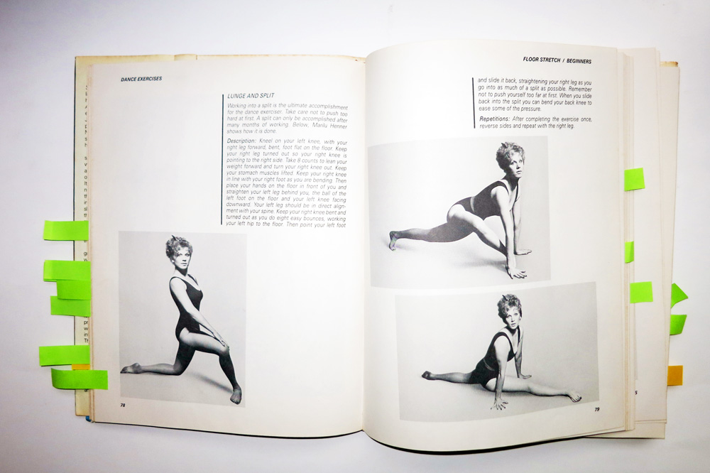 Description: “Kneel on your left knee with your right leg forward, bent, foot flat on the floor. Keep your right leg turned out so your right knee is pointing to the right side. Take 8 counts to lean your weight forward and turn your right knee out. Keep your stomach muscles lifted. Keep your right knee in line with your right foot as you are bending. Then place your hands on the floor in front of you and straighten your left leg behind you, the ball of the left foot on the floor and your left knee facing downward. Your left leg should be in direct alignment with your spine. Keep your right knee bent and turned out as you do eight easy bounces, working your left hip to the floor. Then point your left foot and slide it back, straightening your right leg as you go into as much of a split as possible. Remember not to push yourself too far at first. When you slide back into the split you can bend your back knee to ease some of the pressure.”