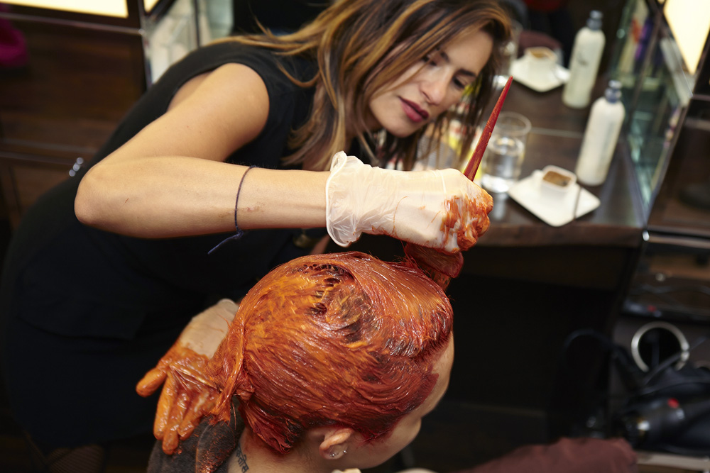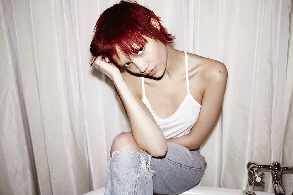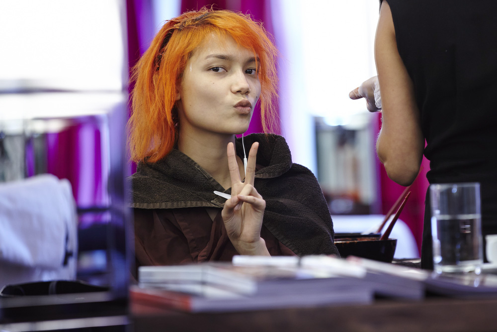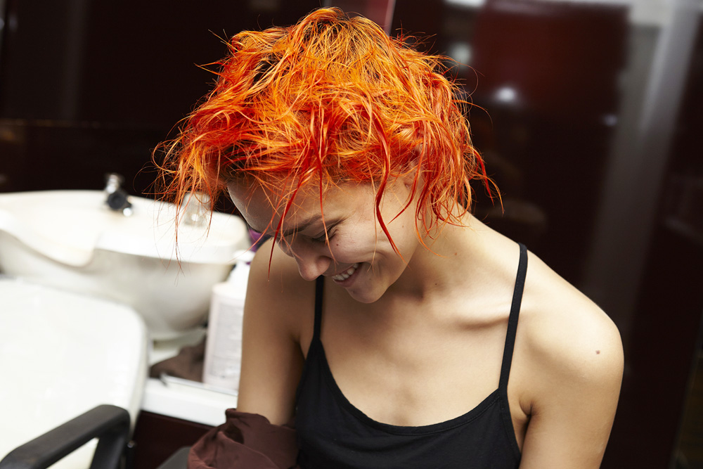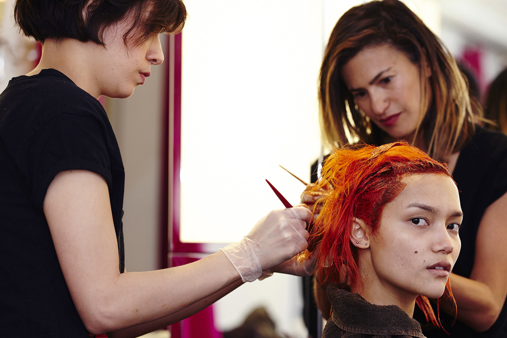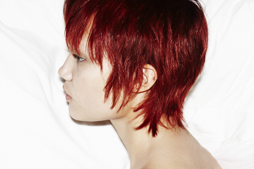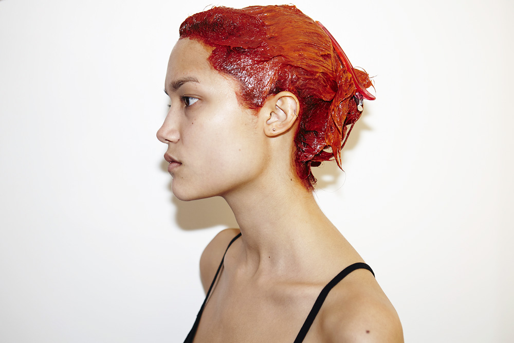 Said Aura: “This hair color was definitely a way of breaking from the 'platinum model' genre, but also just to have fun. Charlotte's Paris agency was sort of pushing her to change it, too, and we all agreed that red was best because we wanted to keep her bold. Going back to brown would be too boring, this color very much fits her personality—it sets her apart. It's definitely going to fade, but there's this product— Nexxus Pre-Wash Primer—that I'm really excited about. You put two pumps in your hand and mush it around before you jump in the shower. It repels water, which causes color to fade and all kinds of build-up. But I love how fiery the red is right now—and the bleached brows we did really bring out that kind of 'alien pixie' look that we love.”
