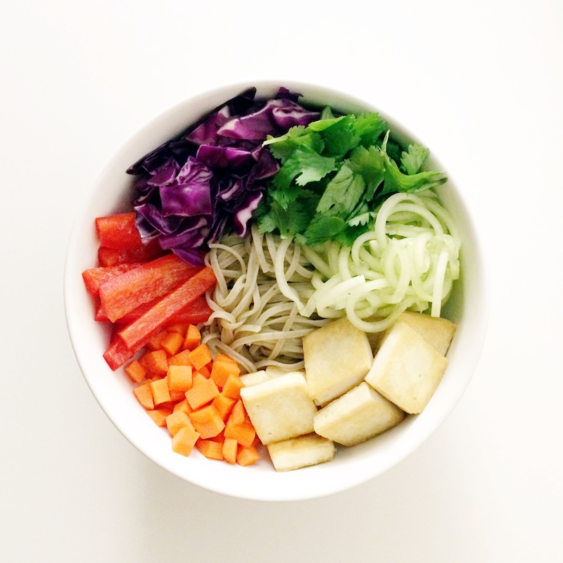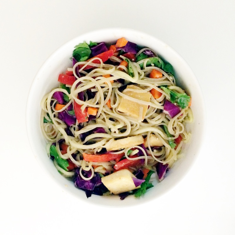 - Place noodles in a large mixing bowl along with the cucumber, pepper, cabbage, carrots, cilantro, and tofu. Toss with about half of the dressing.