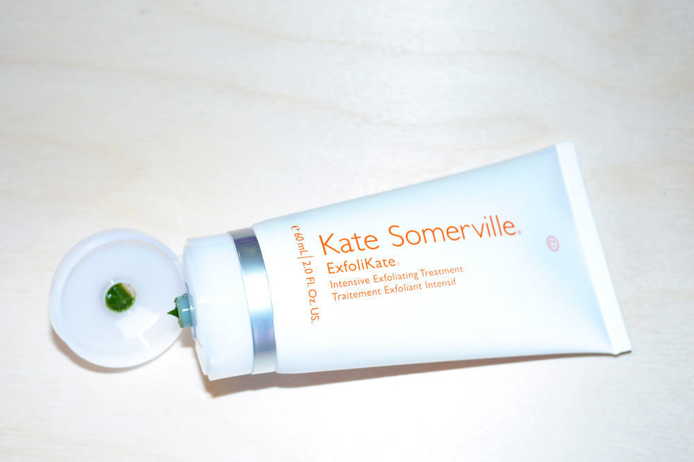 And that's why I love love love Kate Somerville's ExfoliKate, which marries both physical and chemical exfoliation into one asparagus-colored, herby pineapple-scented paste. The physical exfoliator comes in the form of tiny beads that feel like fine grains of sand, and it contains everything from fruit enzymes to lactic acid which rep the chemical side of things. After washing, I pat dry, mist my face with Evian water, and gently massage a two pea-sized amount of ExfoliKate around my face in small circular motions—concentrating on any areas where I'm a bit flakey, like where a zit has healed and the scab is hanging on for dear life. This part doesn't last any longer than about 20 seconds. Then I just let it sit for about a minute, so the enzymes and acids can get to work. I rinse with lukewarm water, pat dry, and glow. I really like using it when I need perfect makeup application—the smoothing results are instant and I guess you could say similar to a resurfacing project, leaving to fresh and ready to paint. Or just ready for moisturizer—your skin will soak it up.