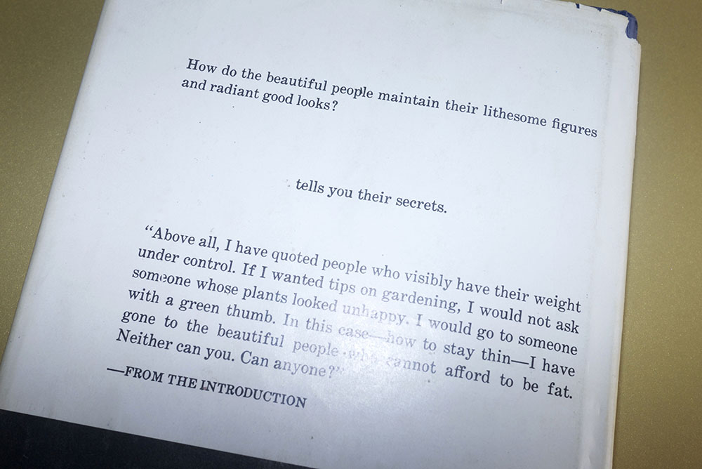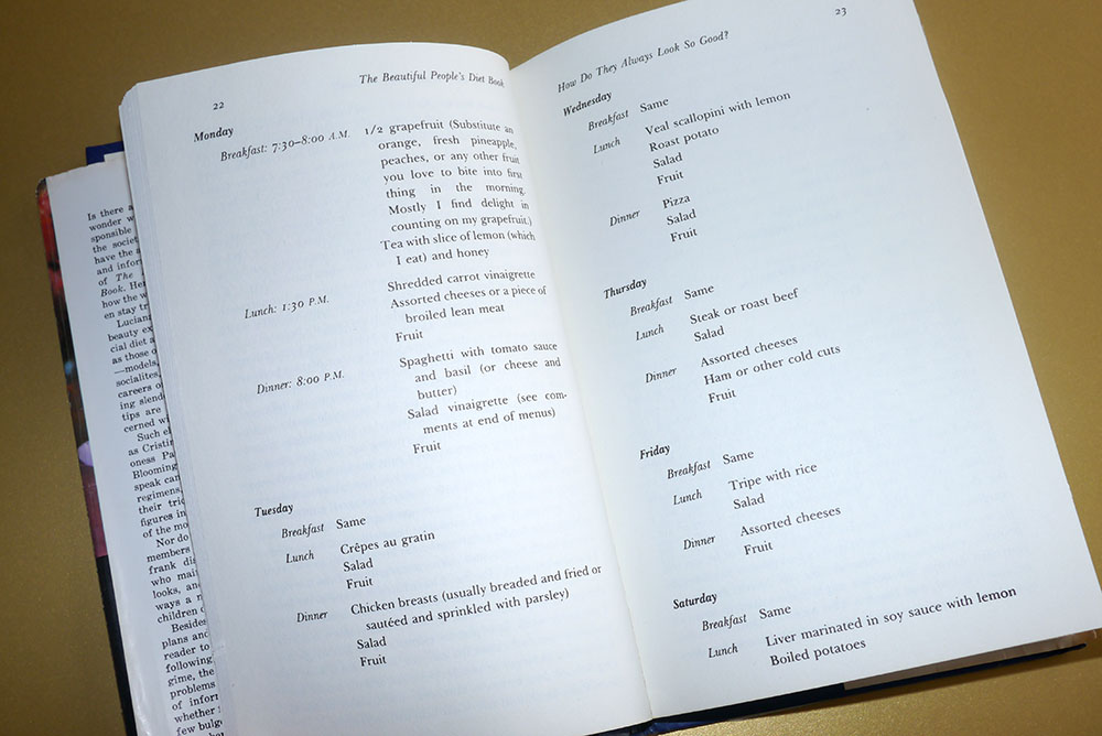 Today, we leaf through the pages of the follow-up advice book she published three years later, The Beautiful People’s Diet Book. By the time she wrote it, she’d gotten remarried to a cousin of Richard Avedon’s and changed her name, hence the byline. Still: once a princess, always a princess.
