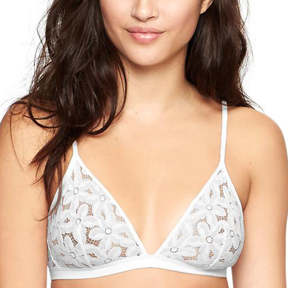 Gap Daisy Lace Triangle Bra : Everyone should have a reliable white triangle bra in her lingerie drawer. While it may not be the most effective style in terms of support, a delicate and innocently hued piece like this one will keep your bra-baring look safely out of the “slutty” subgenre of dressing.