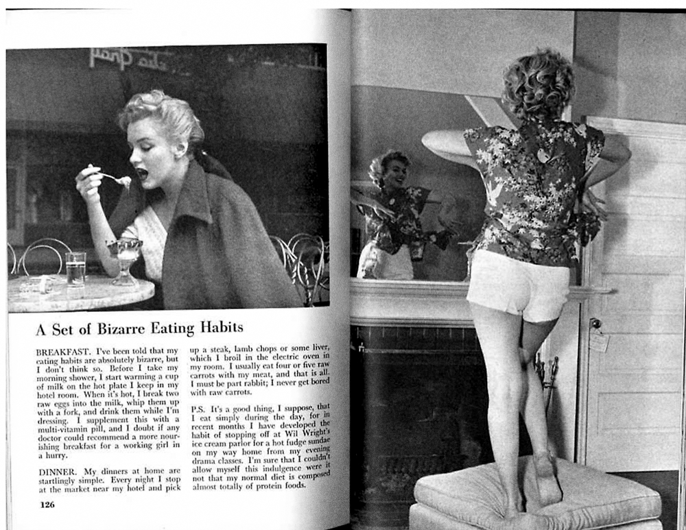 Recently, I stumbled onto one of the coolest things I've ever found: Marilyn Monroe's Top Shelf, circa 1952. Apparently, Ms. Monroe gave Pageant magazine a huge exclusive, complete with sauna tour, diet advice, workout tips, and plenty of bon mots about her lifestyle. It was just too much of a gem not to share, so I've reproduced it here. I'm not advocating Marilyn's diet, but it's a fascinating look at one of the 20th century's most iconic women. The text is a little hard to read, so I transcribed Marilyn's quotes below. Enjoy!