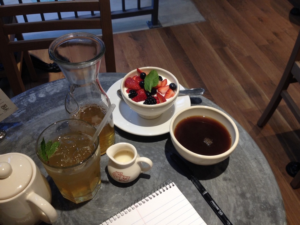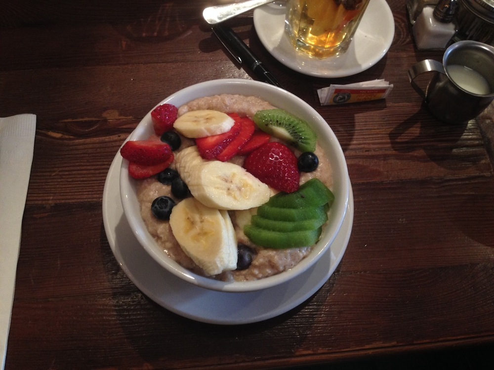 Breakfast : Oprah Chai Latte from the Starbucks conveniently located 100 feet from my hotel. Coffee is provided at the conference and I don’t want it to seem like I’ve snubbed free conference coffee in favor of $4 Starbucks coffee, so I conceal my drink by pouring it into a generic cup. I take it with me to a panel and drain it distractedly. So far I’ve spent about $20 on these things. For a second course, I get oatmeal and fruit in the lobby.