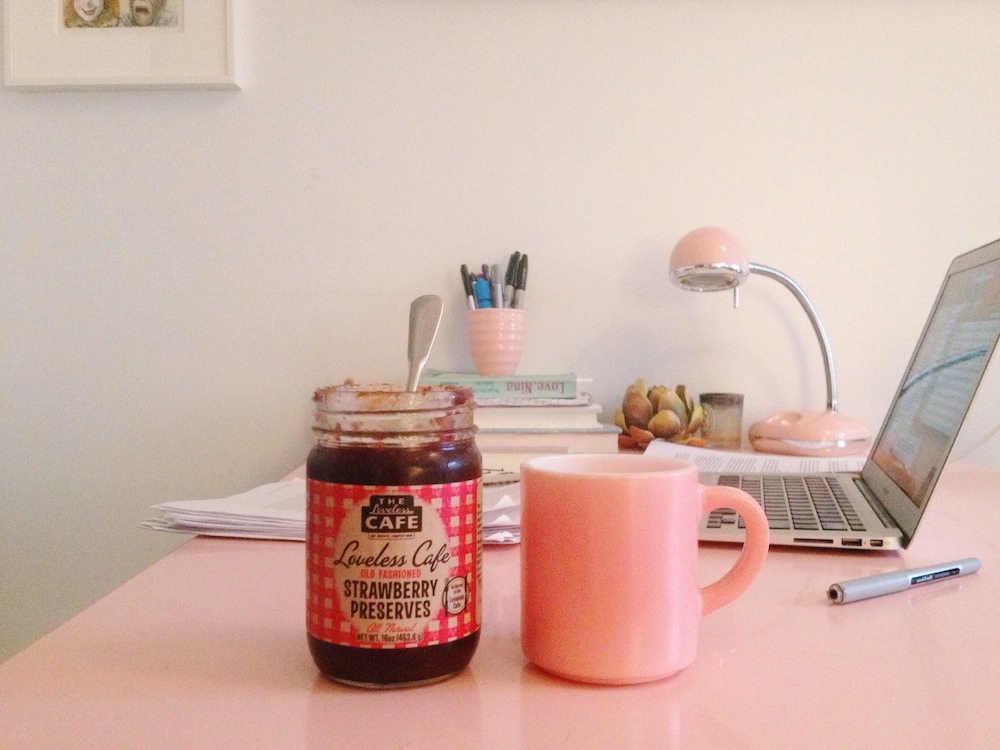 Breakfast : I open a jar of Loveless Cafe Peach Preserves and take a little bite—it’s far too sweet, even for jam. The label lists just two ingredients: peaches and sugar. So there’s your problem: it’s always important to have lemon juice (or some other acid) in a jam to cut the sweetness. I empty a few spoonfuls into a thing of Greek yogurt, which palliates the sugariness. The peaches are chunky. Love a chunky preserve.