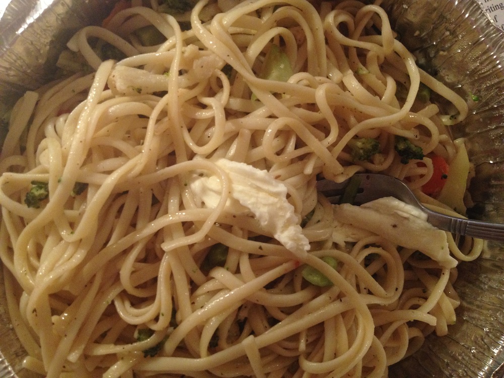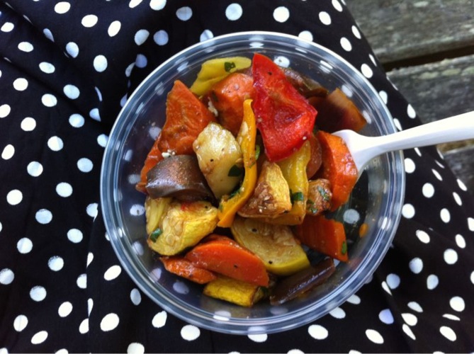 Snack: Mixed grilled vegetables from the supermarket buffet.