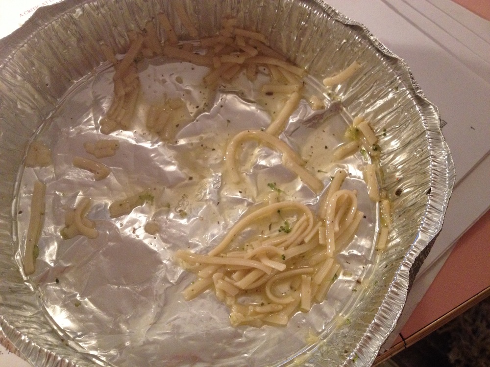 Dinner : Pasta with mixed veggies sautéed in olive oil. Oprah says to add lots of black pepper and the juice of one lemon, so I do. Also a dollop of truffle butter. Close to the finish line, I notice a pool of oil at the bottom of the takeout container, which suggests that the pasta contained more than Oprah’s recommended 2 tsp. The frustrating thing with pasta is that it physically inhabits my stomach without ever satisfying me, so I am still peckish...