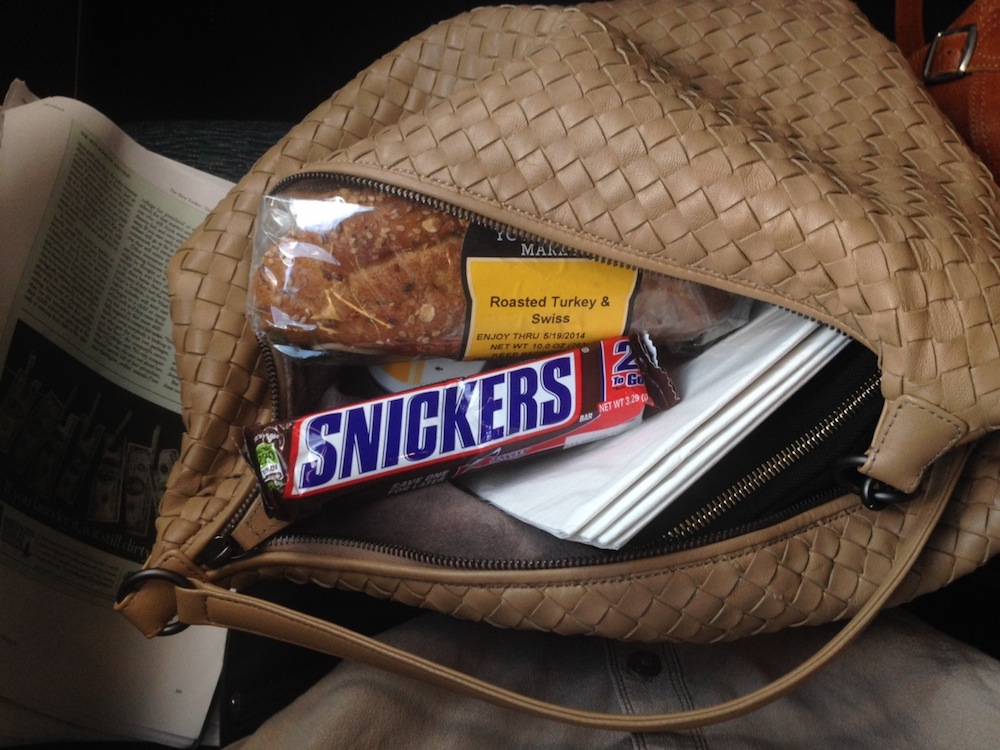 Lunch : I buy a turkey sandwich in the train's cafe car. Oprah makes her turkey sandwiches with Ezekiel 4:9 Organic Sprouted Whole Grain Bread and a thin slice of pepperjack cheese, but this isn’t too far off: the Amtrak bread is multigrain and it contains only a small amount of Swiss cheese. As you can see, I did a bad thing and bought a Snickers, too. This is the only time I have cheated on the diet so far. Nothing is easy.