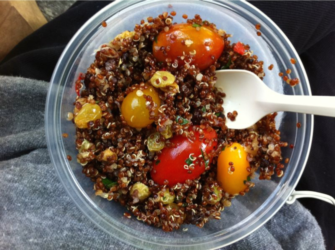 Lunch : Quinoa salad with vegetables from Whole Foods. Must say, I’m not a huge quinoa fan. There are so many alternatives with better flavor: farro, teff, pearl barley, and the Jewish woman’s fallback, kasha. Quinoa is tolerable, but I prefer the nutty end of the flavor spectrum to the grassy end. Not very hungry.