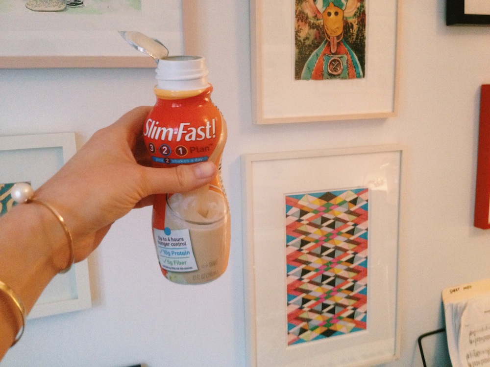 Dessert : One Slim-Fast Optima French Vanilla drink. Tastes like barium sulfate (the stuff doctors give you before having a GI x-ray) and has 18 grams of sugar in a serving, which is more than a package of Reese’s Peanut Butter Cups.