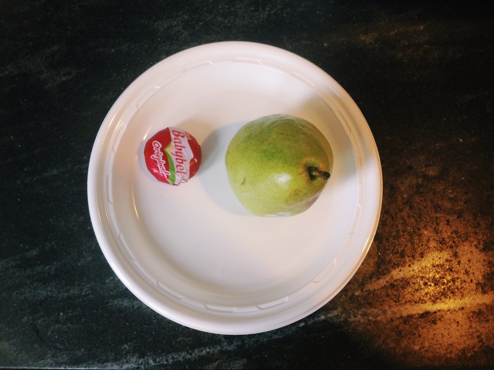 Snack : I have one pear and one ounce of cheese. Later, one ounce of dark chocolate.