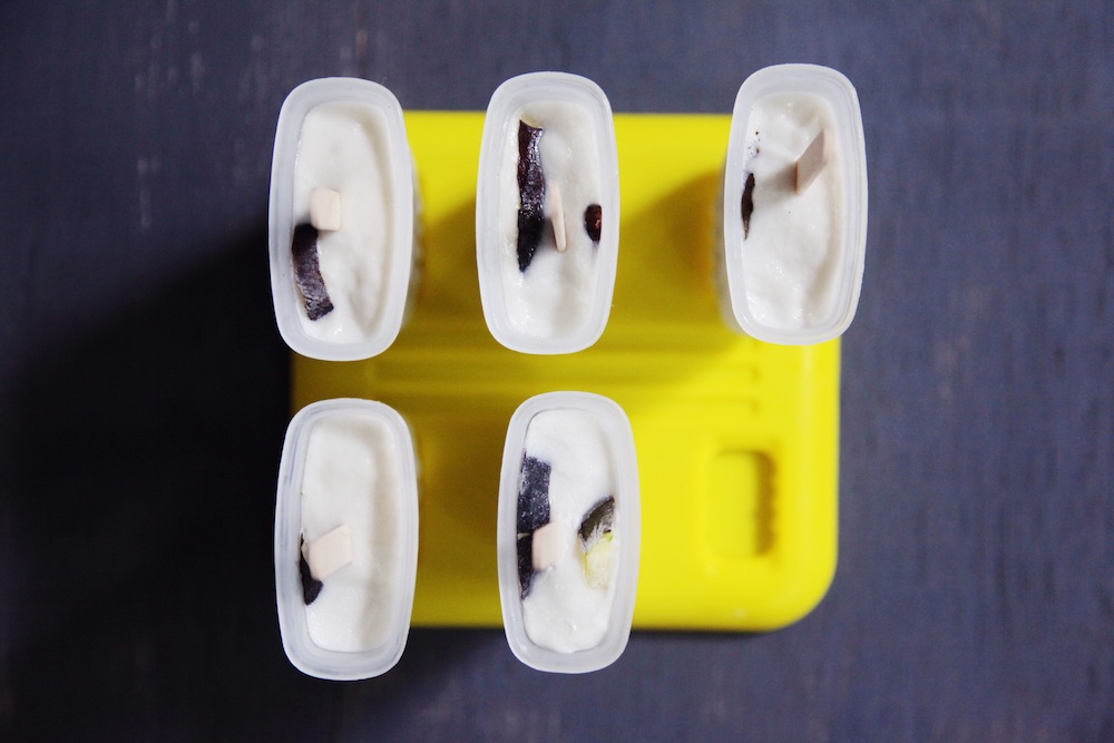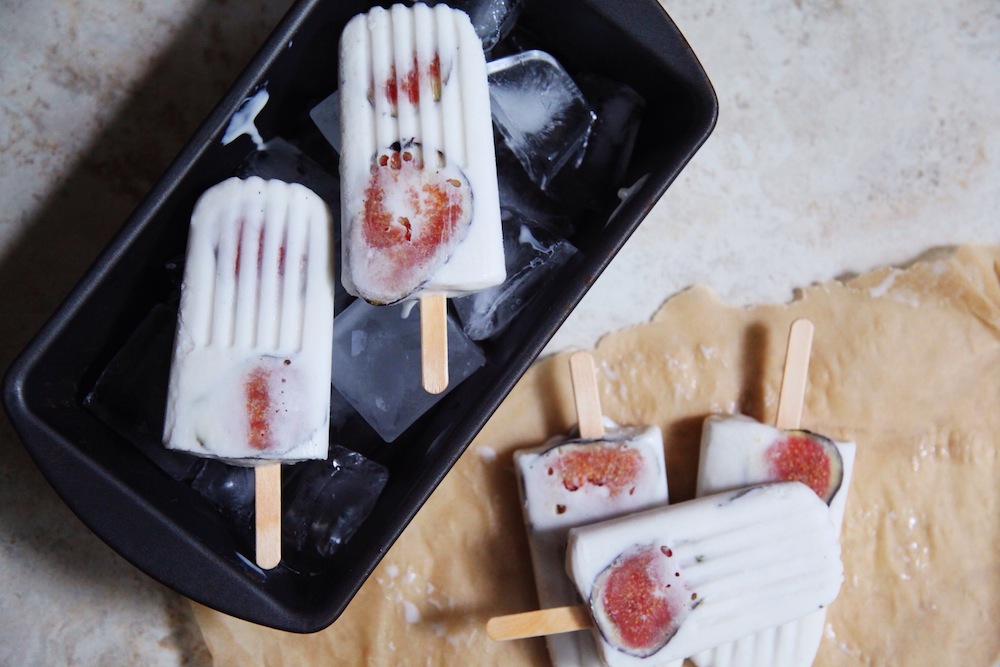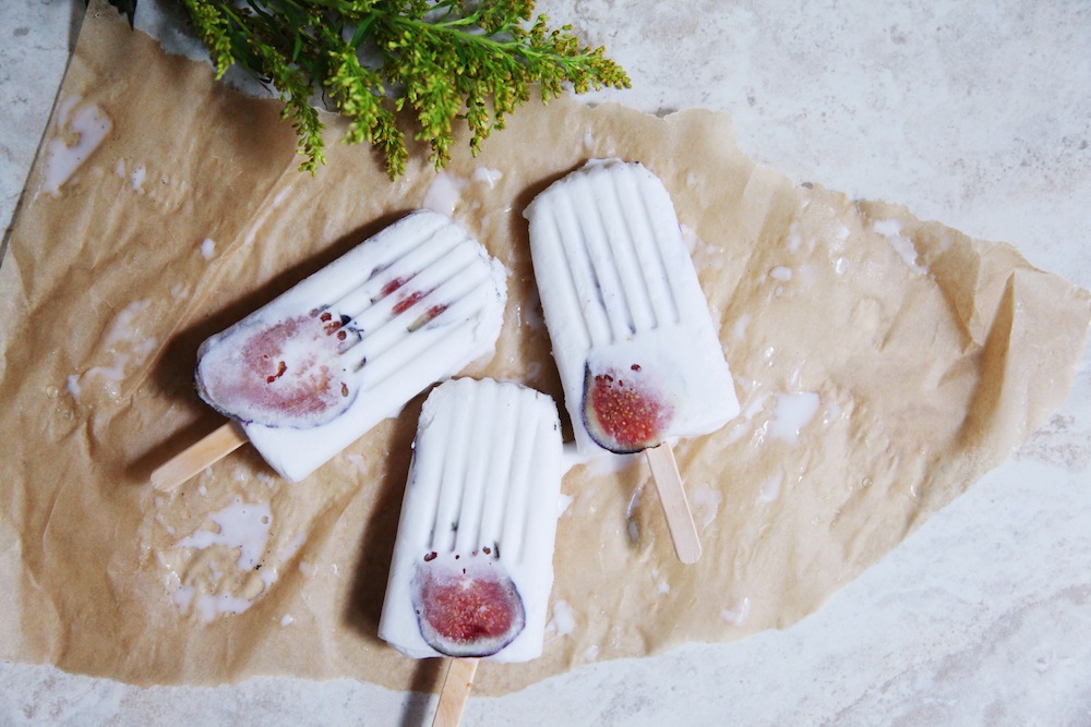 Combine all ingredients except for the figs in a large bowl and whisk to combine. Place fig slices into the popsicle molds and press against the sides. Pour the mix into the molds and freeze. If you don't have popsicle molds, paper cups work well too. Makes 6 popsicles.