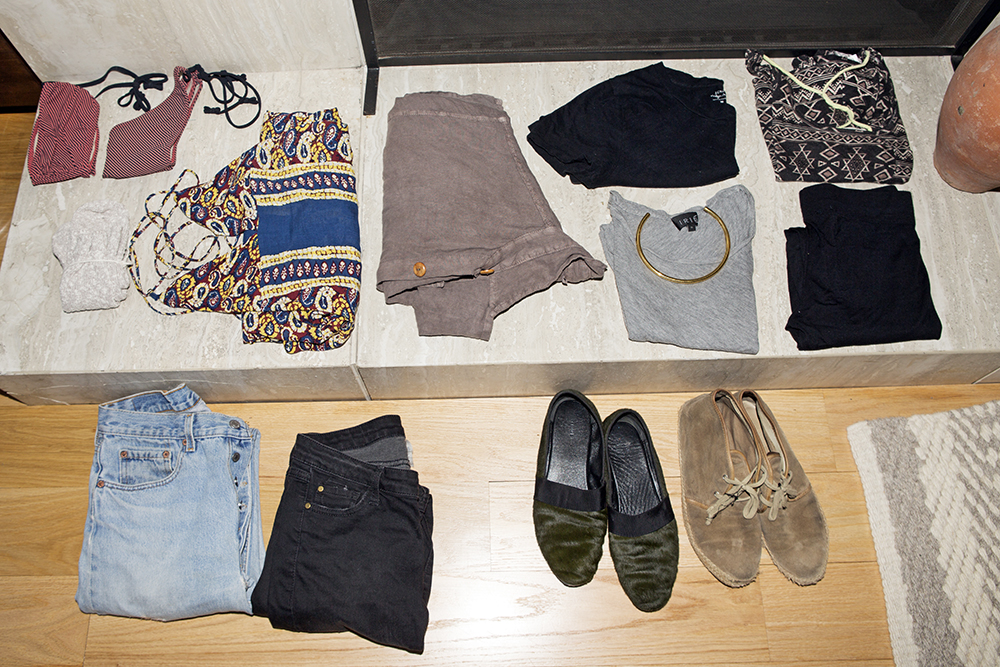 "I take two button-downs, a sweater, three basic white shirts, three black ones*, Acquaverde or Frame jeans, and then my running and yoga stuff—black leggings and a Billabong tank. I have the day-of-the-week underwear from Stella McCartney and make sure to have socks for the plane. And always flats, like Birkenstocks or Céline. If I'm going somewhere summery, I take a dress, like this Tallow one, and a Philip Lim bandeau bikini. That's it,”