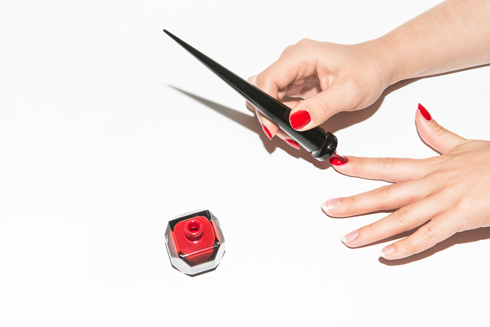 Flash forward several years to find a shiny new pair of satin heels printed with red lacquered nails in celebration of the launch of the Christian Louboutin's very own glossy red polish—the first of many shades to come. (It's good. Very red, with a thin enough consistency that allows for easy spread but that delivers loads of pigment with only one coat.)