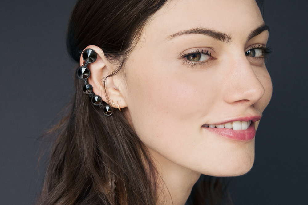 Phoebe Tonkin photographed by Tom Newton, styled by Annie Kreighbaum. She wears Catbird Ear Cuffs in 14K Yellow Gold, BRVTVS Large Double Bar Cuff, and BRVTVS Large Single Bar Cuff [photo 1]; Zoë Chicco 14k Pave Triangle Cuff [2]; the Sarah Chloe Organic Petite Ear Cuff [3]; Moschino Anniversary Hoop Earrings [4]; Moschino Anniversary Zipper Earrings [5]; Jean Paul Gaultier Jet Ear Cuff [6]; Rackk + Ruin Stippled Septum Cuff [7]; Bijules Double Helix Opal Cuff [8]; Rodarte Dragon Ear Cuff [9]; magnetic studs from H&M [10].
