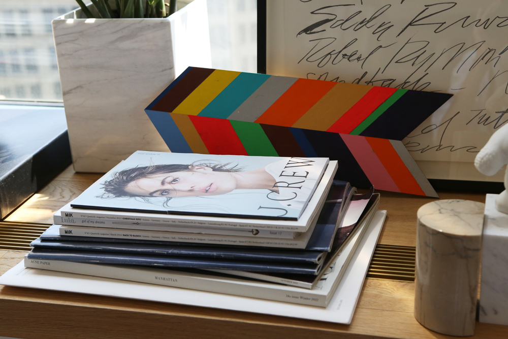 It’s funny, I love the smell of 57 quite a bit and I've been trying to wear it, but my son is completely not tolerant because I’ve been wearing the same perfume since he was born. He’s like, ‘You don’t smell like my mom! Where’s your perfume?’ But I still get to smell the new fragrances in the office, of course. I'll pass by and think, 'Mmm, that smells nice! It's ours? OK, cool, I still like it.' Everyone’s wearing them—they work for both men and women. Everything we do roots back to menswear in the end, so the idea that our perfume or a cologne might be suitable for one or the other makes complete sense. I mean, I wear men’s clothes half the time anyways. I get them from everywhere, but J. Crew’s easiest because I can get everything tailored—I know some people. [Laughs]