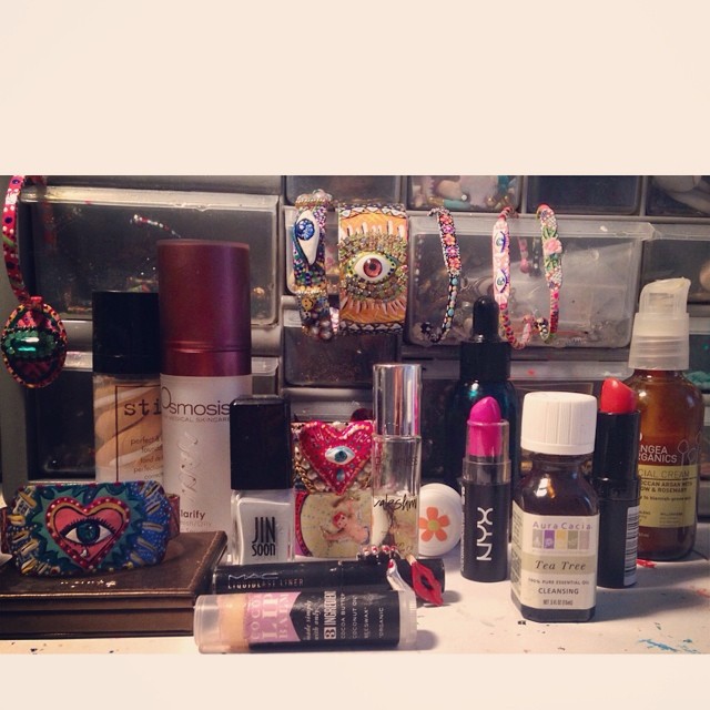 Now for the fun stuff—makeup. When I was younger, I remember my grandmother saying 'A woman without lipstick is like a day in Florida without sunshine,' so naturally I am a lipstick maven. I have recently fallen under the spell of the Kate Moss Rimmel collection—every color is perfect. I also use NYX Matte Lipstick and of course, the elusive RiRi Woo, which is super chalky, but damn what a perfect color. The best best best liquid eyeliner in the whole world is MAC Liquidlast Liner in Point Black. It will stay on your eyelids for maybe 100 years if you don't remove it, which is perfect if your skin is oily. For the rest of my face, Stila Perfect & Correct Foundation is like an Instagram filter and the Tarte bronzer is very natural and a good oil absorber. Oh, and I'm completely fragrance obsessed. I use the Goddess Line Lakshmi Fragrance Oil and have been stopped in the street by people telling me how sexy I smell. I'll alternate that with Escentric Molecules 01 or a blend of a few of the 1,000 samples I have floating around.
