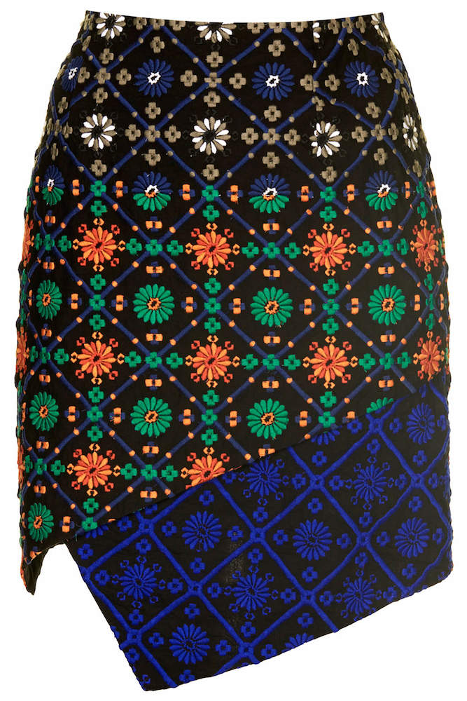 Topshop Limited Edition Wrap Skirt: The embroidery on this multi-layer skirt looks home-sewn, in a great way. To counter the high-contrast pattern, try it with a white button-down.