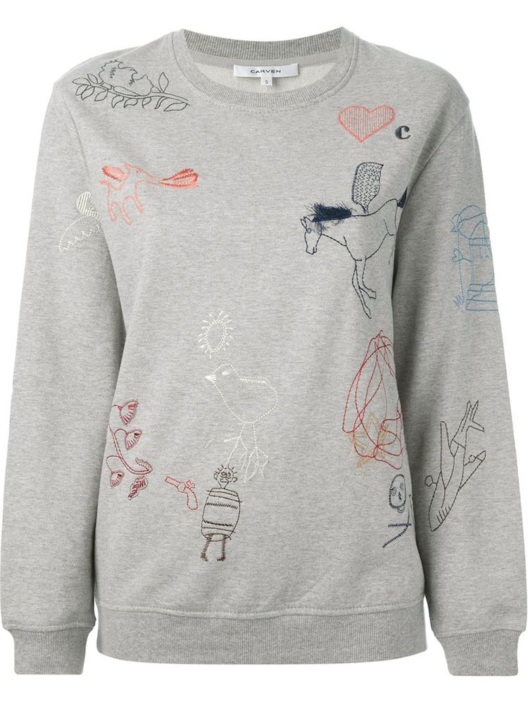 Carven Sweatshirt: French humor a la Jolie-Pitt doppelgänger sketches (a falling unicorn, for instance) is scribbled all over this crew neck. All the whimsy, but built for day-to-day wear.