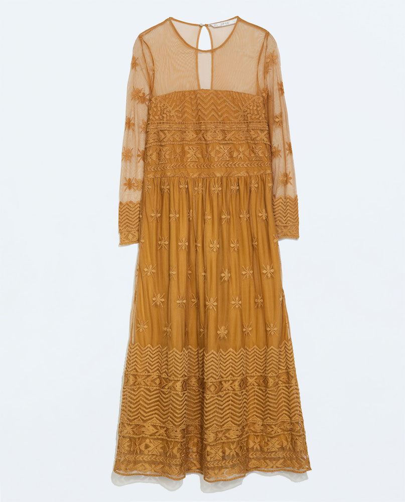 Zara Embroidered Dress: This dress takes the easiness of a nightgown and makes it work for all hours—no jewelry necessary thanks to a streamlined mesh neckline.