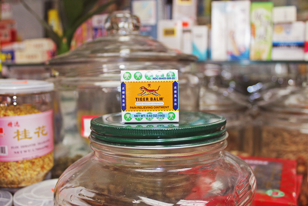 Tiger Balm (Hǔ biāo wànjīnyóu, 虎標萬金油): A tingling cream for joint and muscle pain. Though some people also inhale its aroma or apply to alleviate mosquito bites.