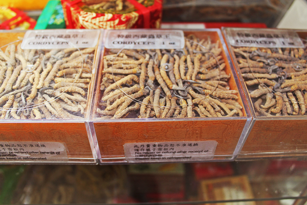 Cordyceps sinensis , literally translated as “Winter Worm Summer Grass” (Dōngchóngxiàcǎo 冬虫夏草): This product is considered the most precious in Chinese medicinal herbs, so it has a price tag to match (at the pharmacy, some were over $1000). It is said to improve overall body and mind health. (More information here)
