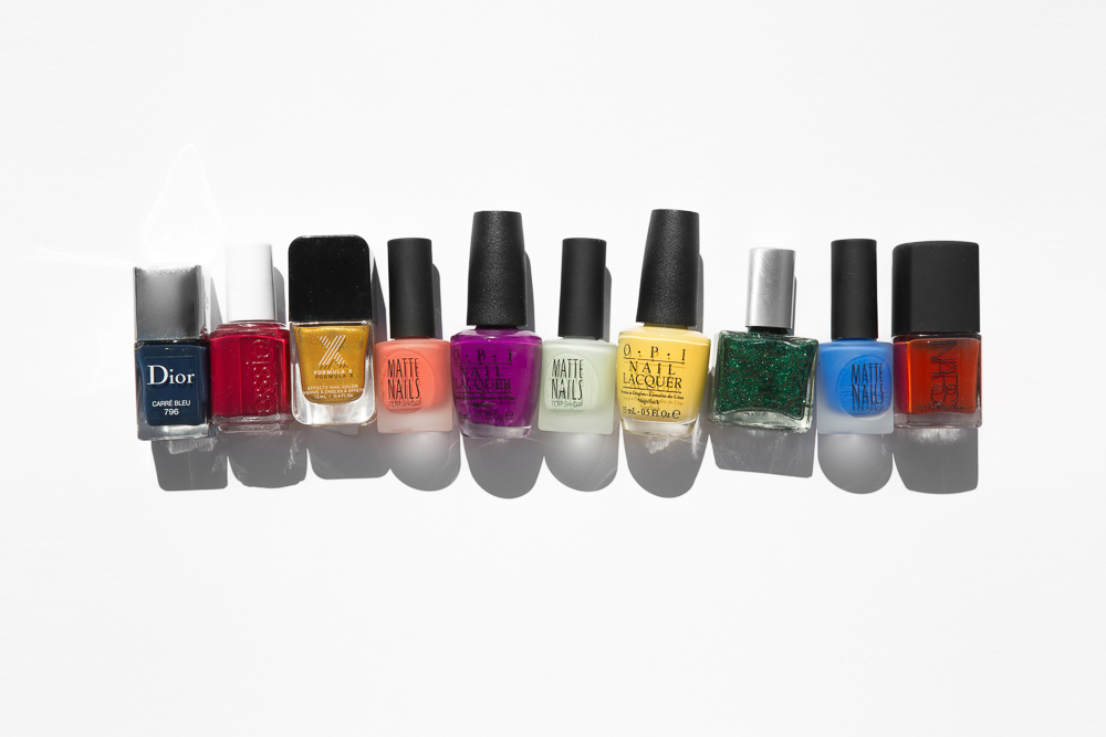 Primaries Plus, from left to right: Dior Vernis Gel Shine and Nail Lacquer in Carré Bleu, Essie Nail Polish in D ress to Kilt, Formula X The Brushed Metallics in Ambitious, Topshop Matte Nails in La Cucaracha, OPI Nail Lacquer in Push & Pur-Pull, Topshop Matte Nails in Unfold, OPI Nail Lacquer in I Just Can't Cope-Acabana, Rescue Beauty Lounge Nail Polish in Meow Meow, Topshop Matte Nails in Sapphire Shores, Nars 3.1 Phillip Lim Nail Polish in Hell-Bent