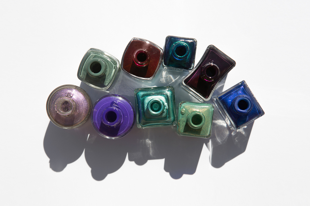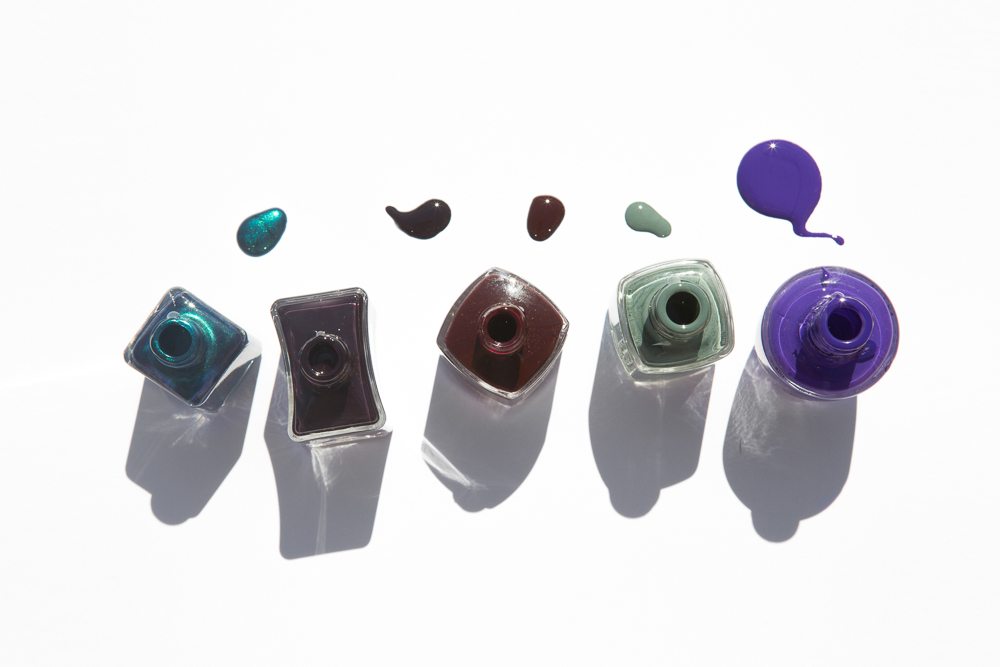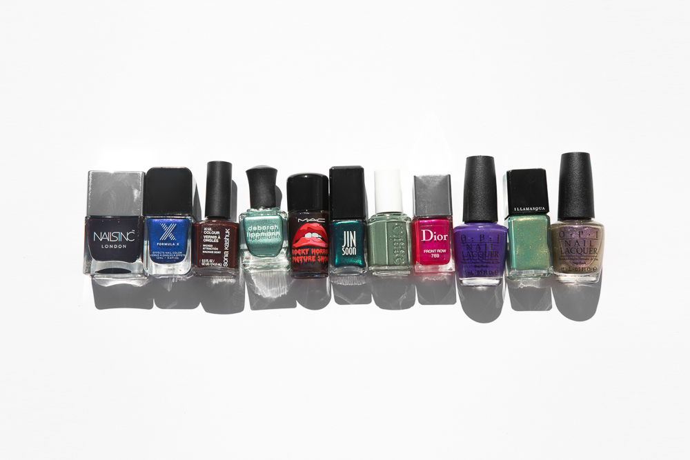 Dark, Stormy, Metallic Night: Nails Inc Gel Effect Polish in Grosvenor Crescent, Formula X The Brushed Metallics in Prophecy, Sonia Kashuk Nail Color in Wicked Attraction, Deborah Lippmann Nail Color in I'll Take Manhattan, MAC Rocky Horror Formidable, JINsoon Nail Lacquer in Heirloom, Essie Nail Polish in Fall In Line, Dior Vernis Gel Shine and Nail Lacquer in Front Row, OPI Nail Lacquer in Do You Have This Color in Stock-Holm?, Illamasqua Nail Varnish in Melange, OPI Nail Lacquer in Next Stop... The Bikini Zone