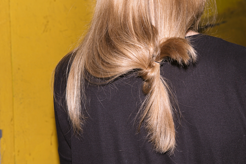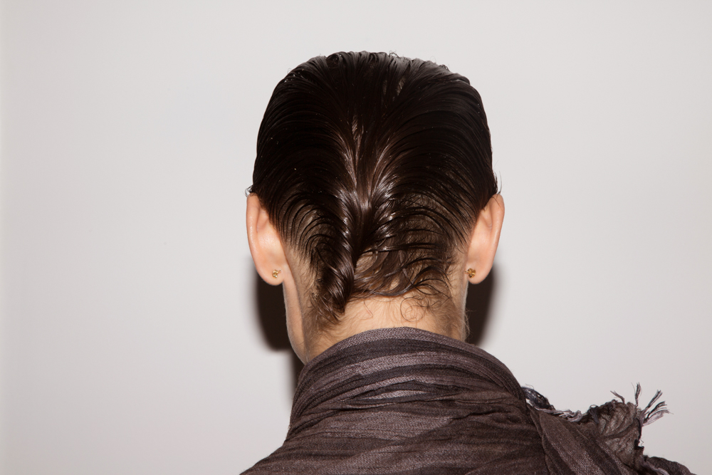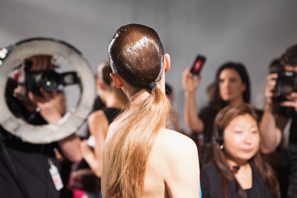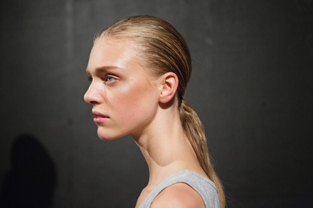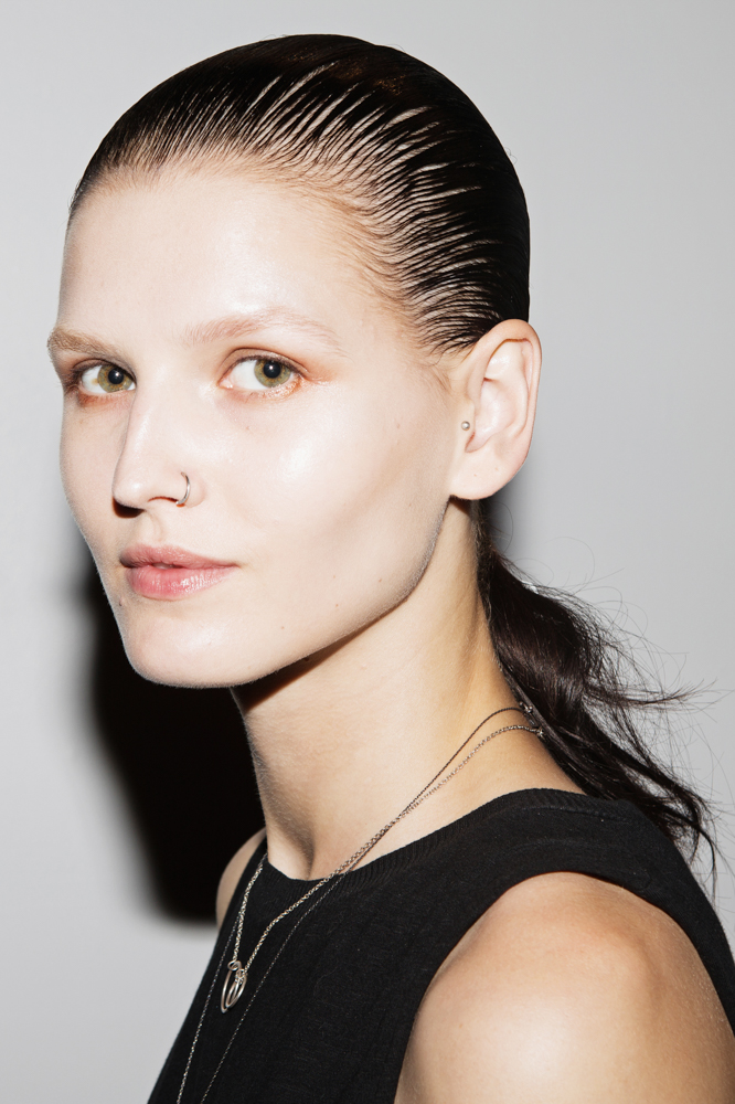 Guido Palau (Redken): “In a way, Alex was talking about how a girl looks when she’s really sweaty with her hair back. Obviously we wanted her to look more sophisticated than that, but he was looking at that sport idea. We’re doing a very simple ponytail that’s been tweaked to become futuristic. It’s a high-gloss texture, which is achieved with Hardwear Gel to create the silicon-like head shape and Diamond Oil Shatterproof Shine to get a super glossy shine. It’s important that ponytail is dragged back and low. It gives a more extreme, austere, and modern look.”