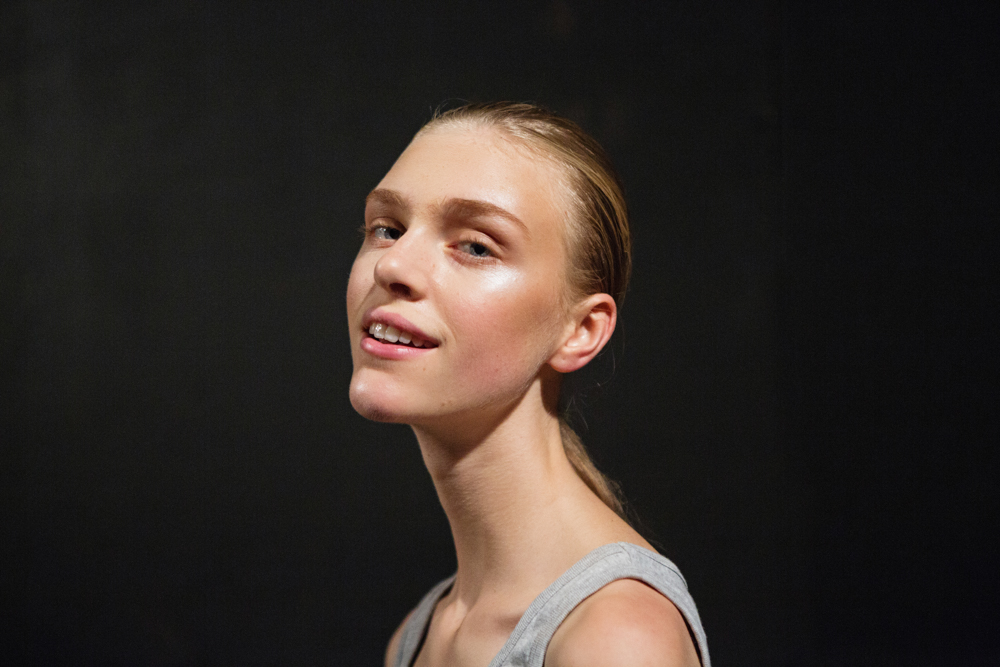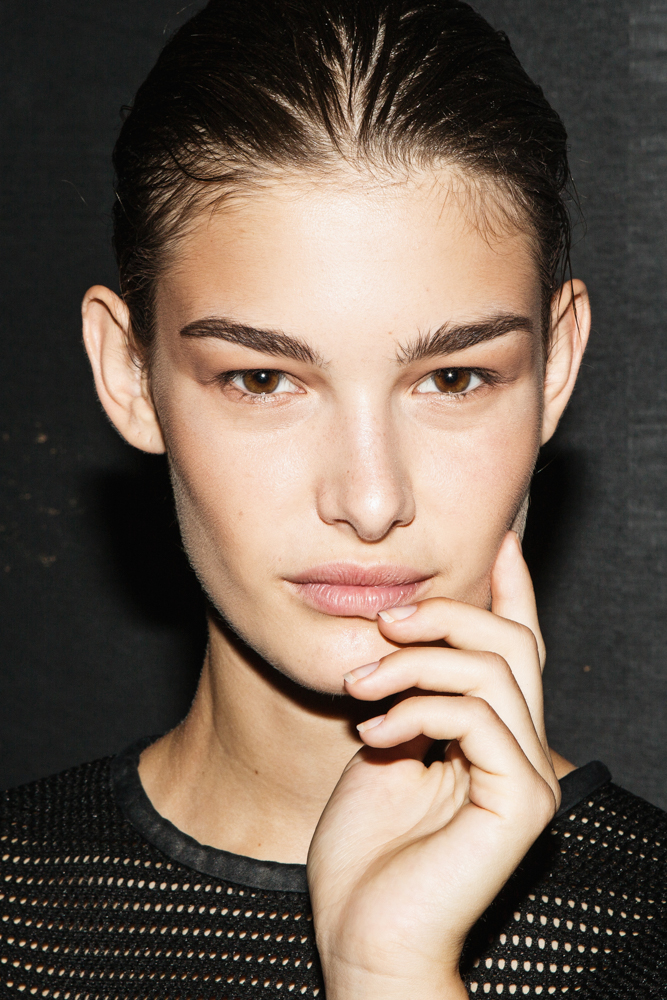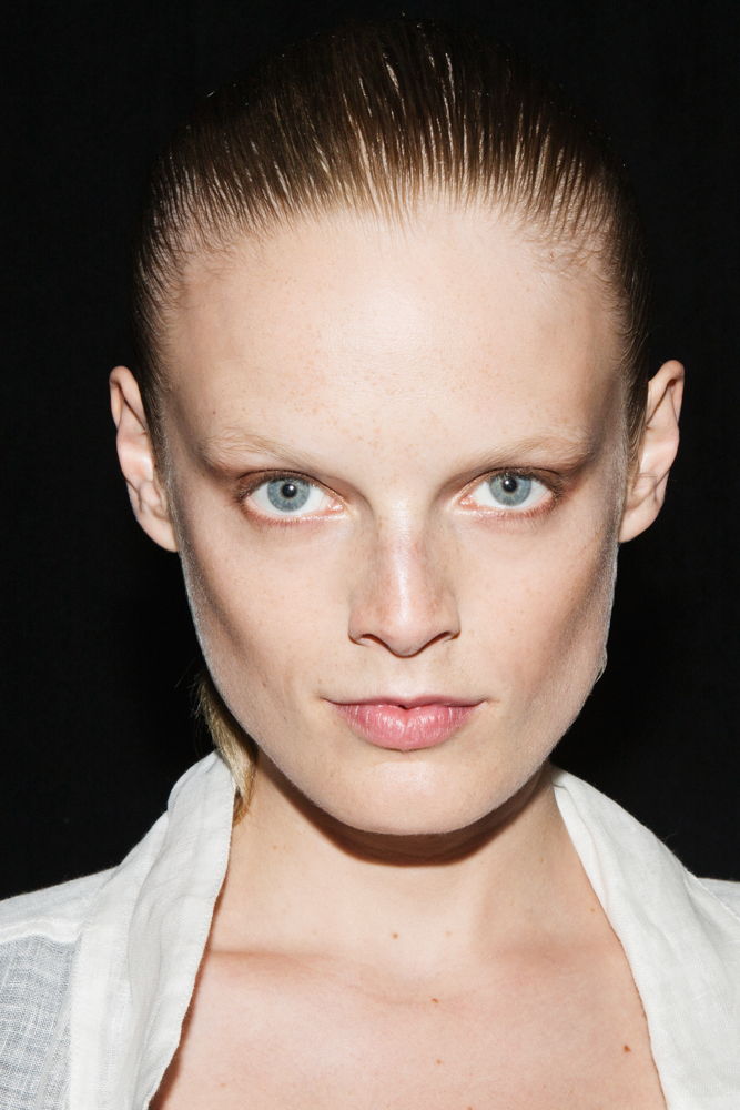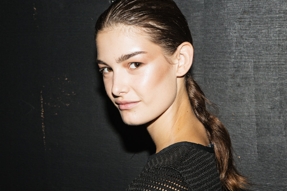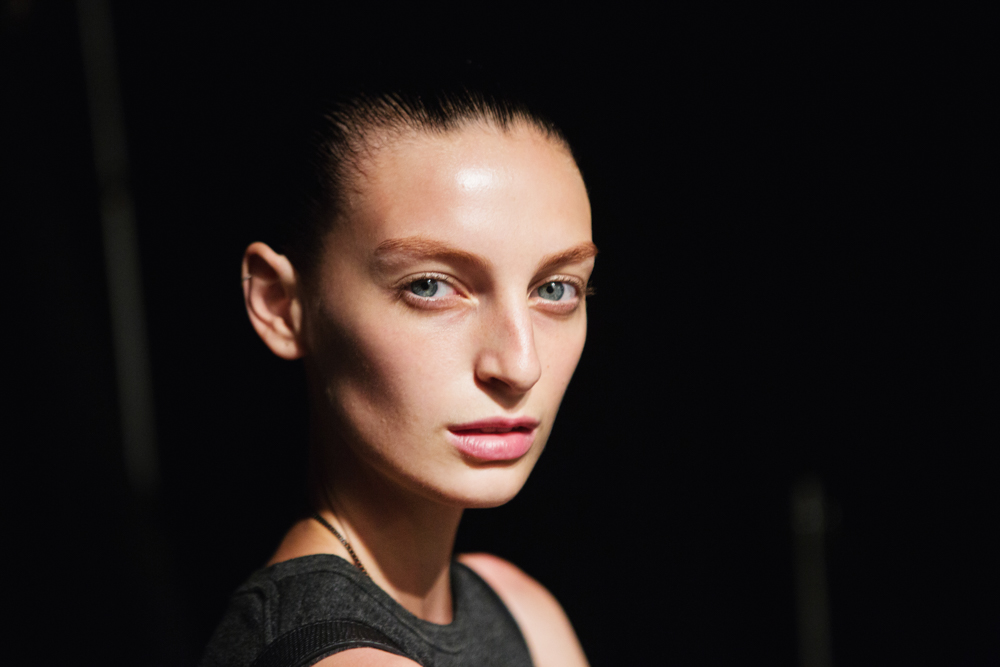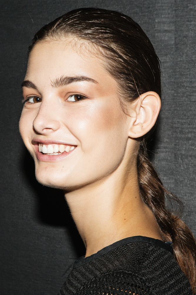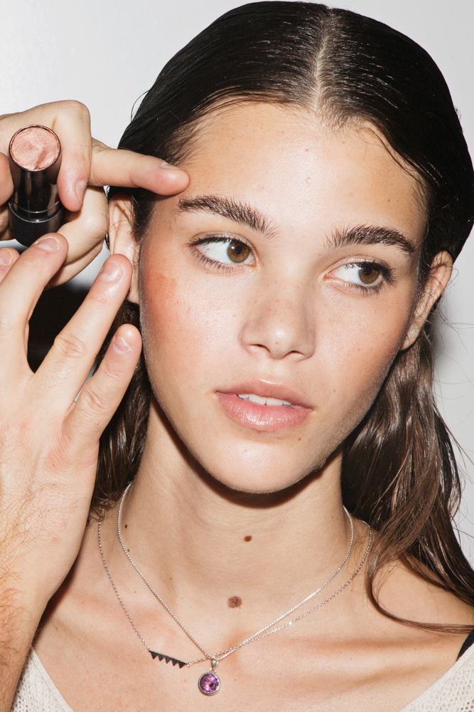 Diane Kendal (Nars): “During Spring/Summer, you always want to have that feeling of skin that’s luminous and dewy. I’m using a white highlighter to get an athletic high-shine, as if they’ve been working out, but in that glamorous way. We’re accentuating the tops of the cheekbones and the brows, and then sculpting the face with the Palm Beach Multiple, conturing the T-zone, and using lip balm on the lips. Guido's taken the hair back into quite a low ponytail, and then with the luminous skin and eyebrows, you get a very bold, strong feel. We’re bleaching the brows, toning them with a cool dye, and then brushing them. We didn’t want to do no brows, but wanted to have that feel of them blending into the skin.”