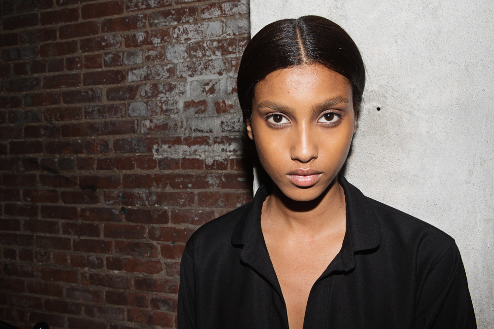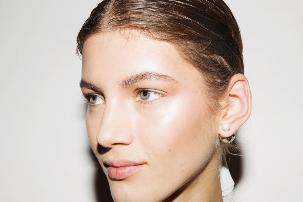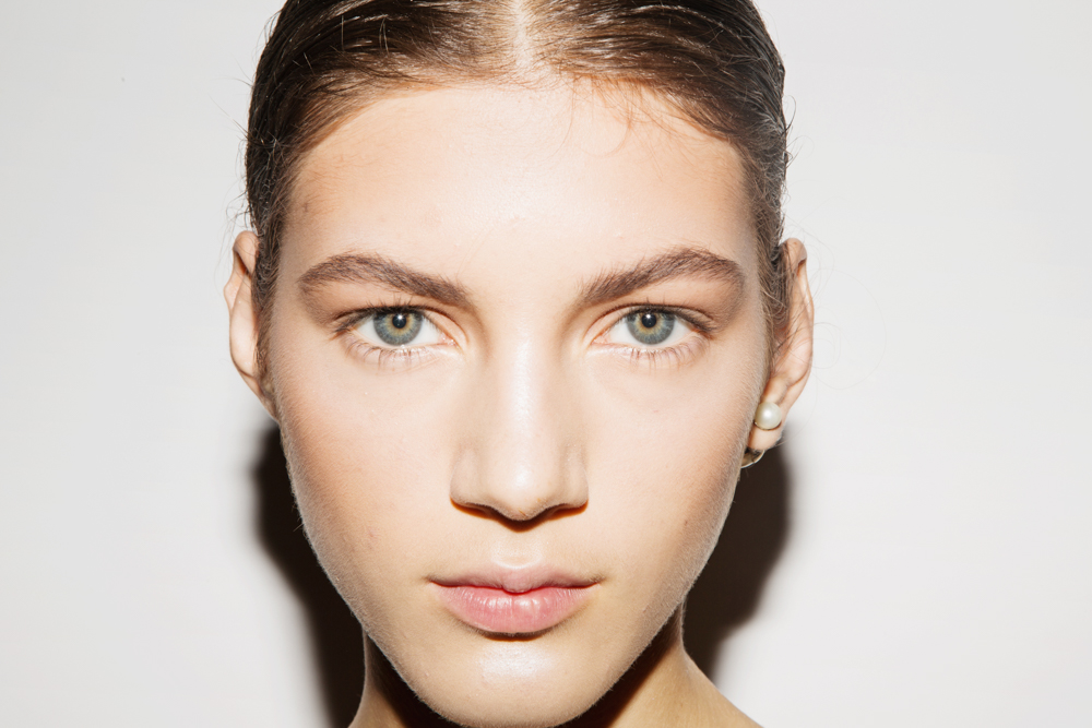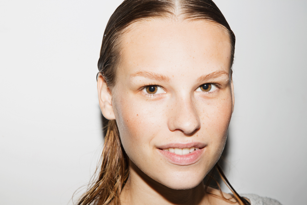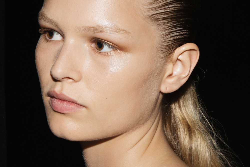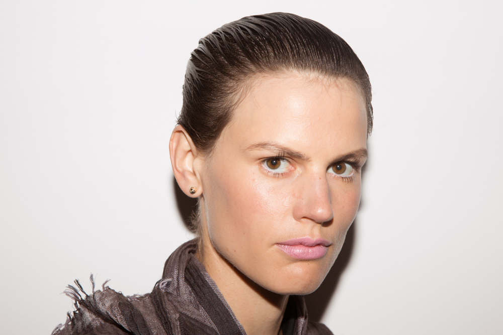 Diane Kendal (Nars): “During Spring/Summer, you always want to have that feeling of skin that’s luminous and dewy. I’m using a white highlighter to get an athletic high-shine, as if they’ve been working out, but in that glamorous way. We’re accentuating the tops of the cheekbones and the brows, and then sculpting the face with the Palm Beach Multiple, conturing the T-zone, and using lip balm on the lips. Guido's taken the hair back into quite a low ponytail, and then with the luminous skin and eyebrows, you get a very bold, strong feel. We’re bleaching the brows, toning them with a cool dye, and then brushing them. We didn’t want to do no brows, but wanted to have that feel of them blending into the skin.”