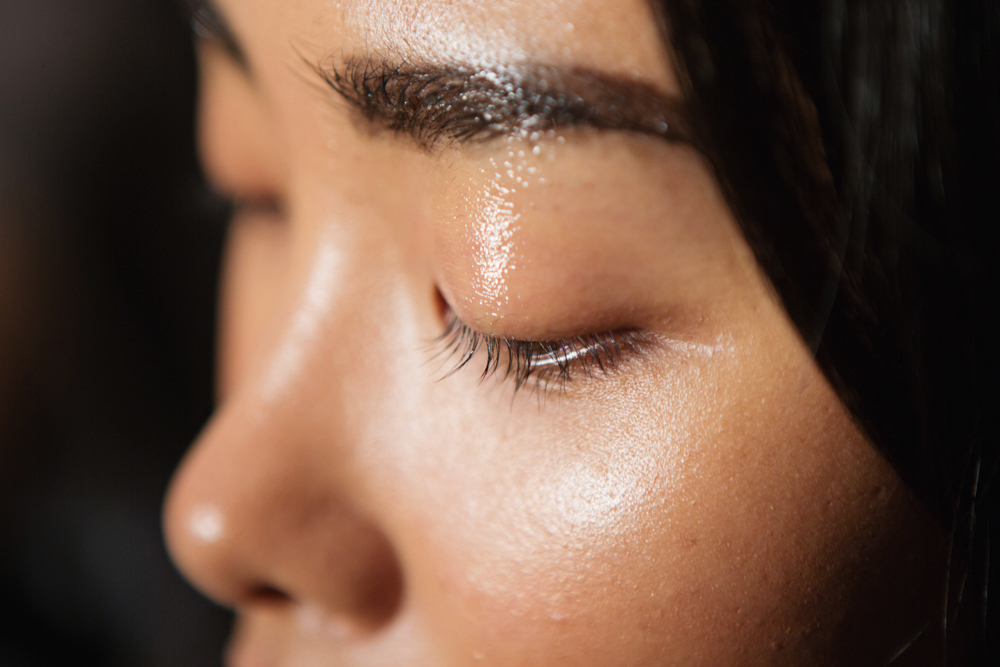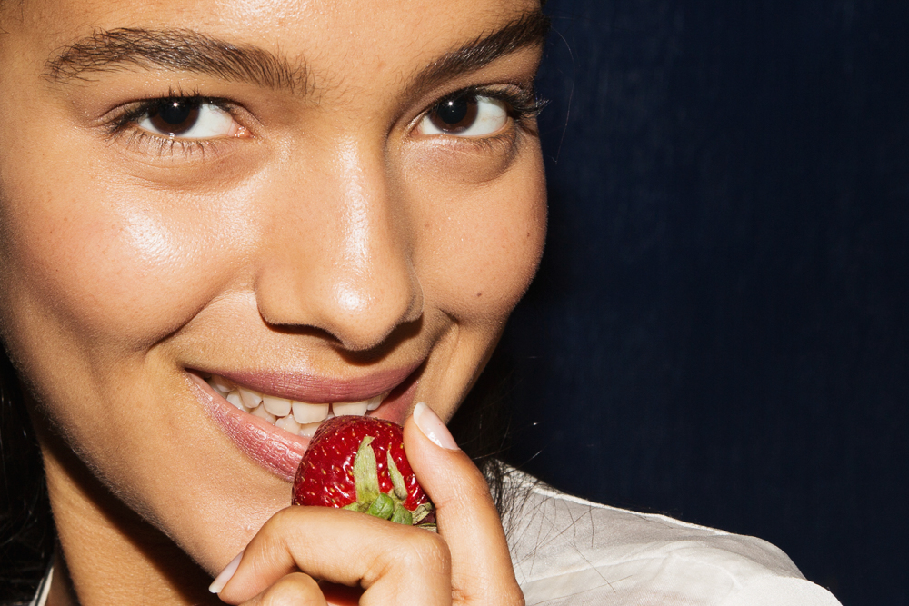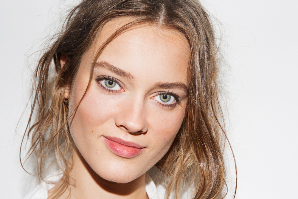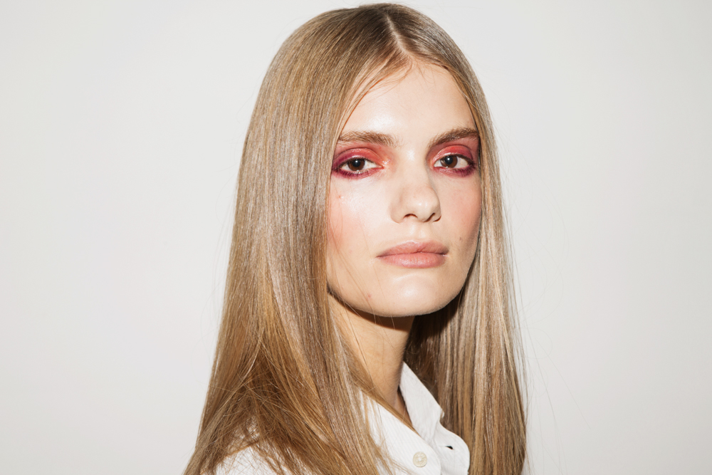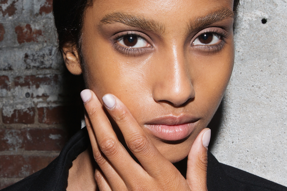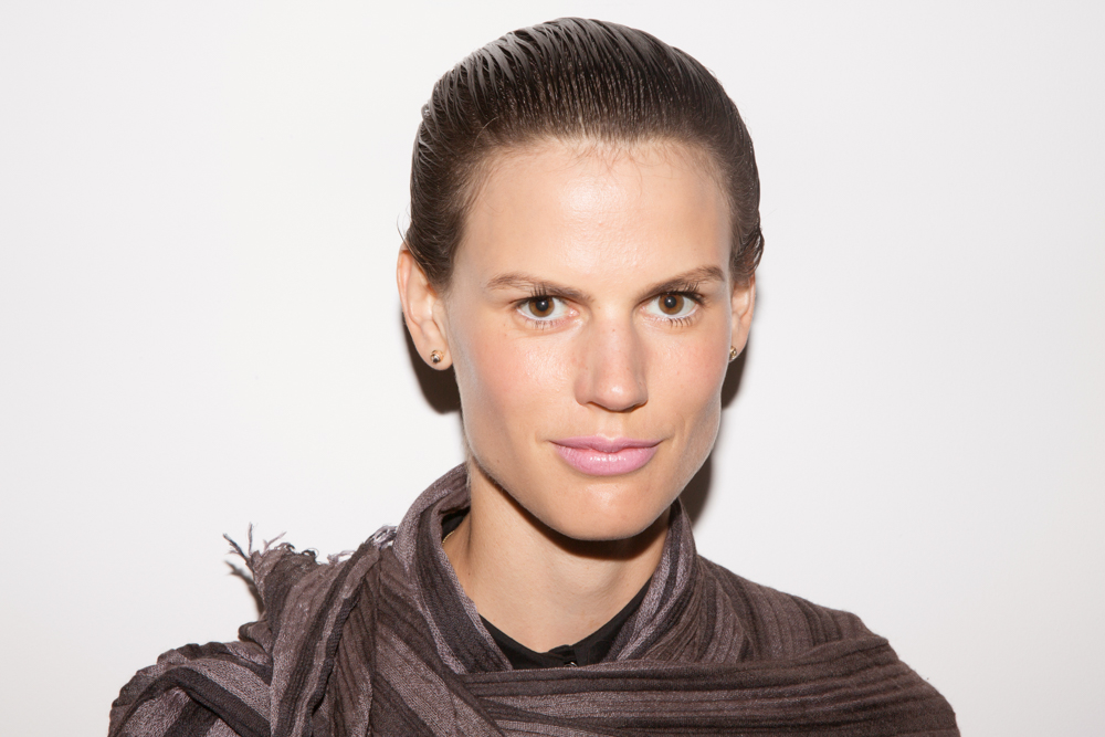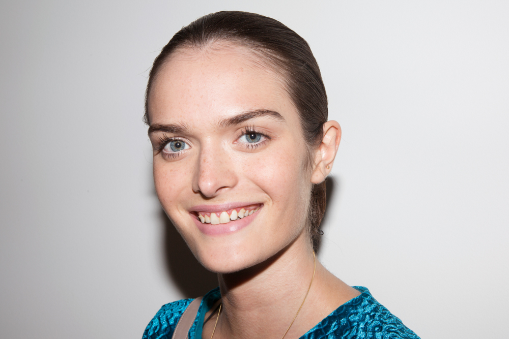 Diane Kendal (Nars): “During Spring/Summer, you always want to have that feeling of skin that’s luminous and dewy. I’m using a white highlighter to get an athletic high-shine, as if they’ve been working out, but in that glamorous way. We’re accentuating the tops of the cheekbones and the brows, and then sculpting the face with the Palm Beach Multiple, conturing the T-zone, and using lip balm on the lips. Guido's taken the hair back into quite a low ponytail, and then with the luminous skin and eyebrows, you get a very bold, strong feel. We’re bleaching the brows, toning them with a cool dye, and then brushing them. We didn’t want to do no brows, but wanted to have that feel of them blending into the skin.”