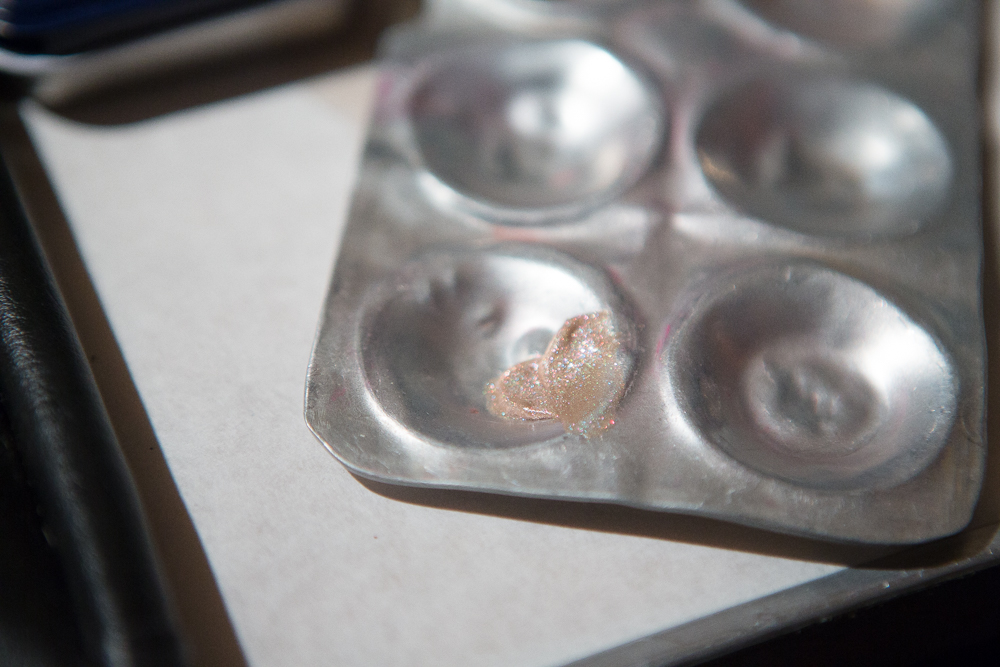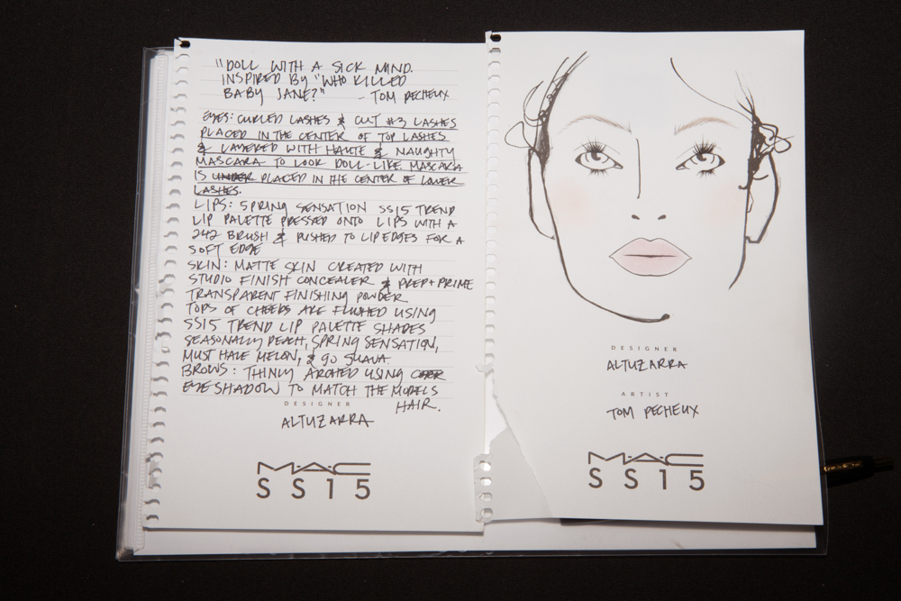 Tom's take: “Very '60s Catherine Denueve-esque. Or that's what they were saying. Odile did the hair which was a chignon variation—kinda simple and elegant from the front and a bit turned up in the back. Everyone's done slicked back hair so far. The makeup was all MAC by Tom Pecheux—very pretty and girly—but not too girly as he said. Annie has a good voice memo, she also reminds Tom of his sister—I hope she caught that part of the interview, he seems like a nice guy! The makeup was '60s with a twist, sorta like the hair I guess. Pink lips, light face, and spiky lashes. Monika/Jac had on a really cool vintage coat. She was so sweet to me.”