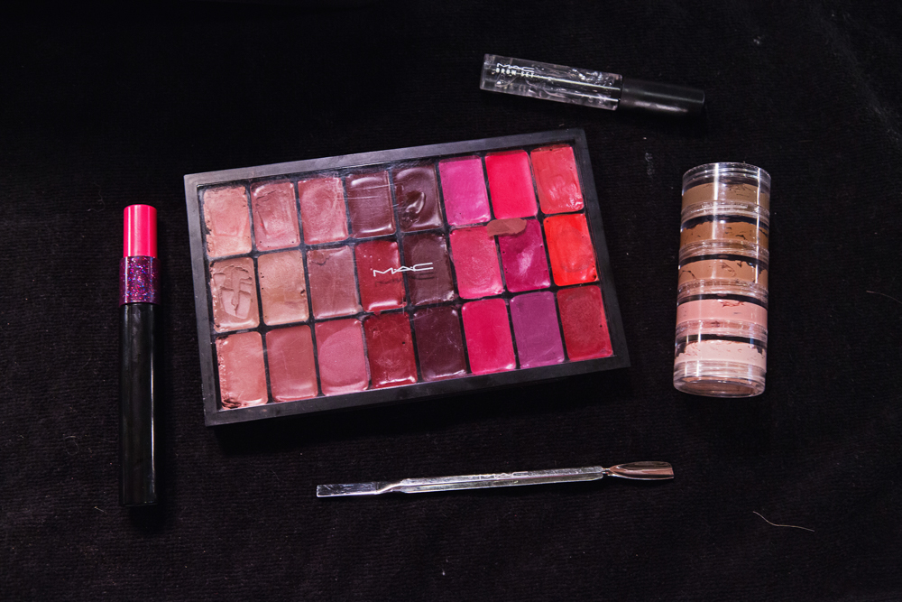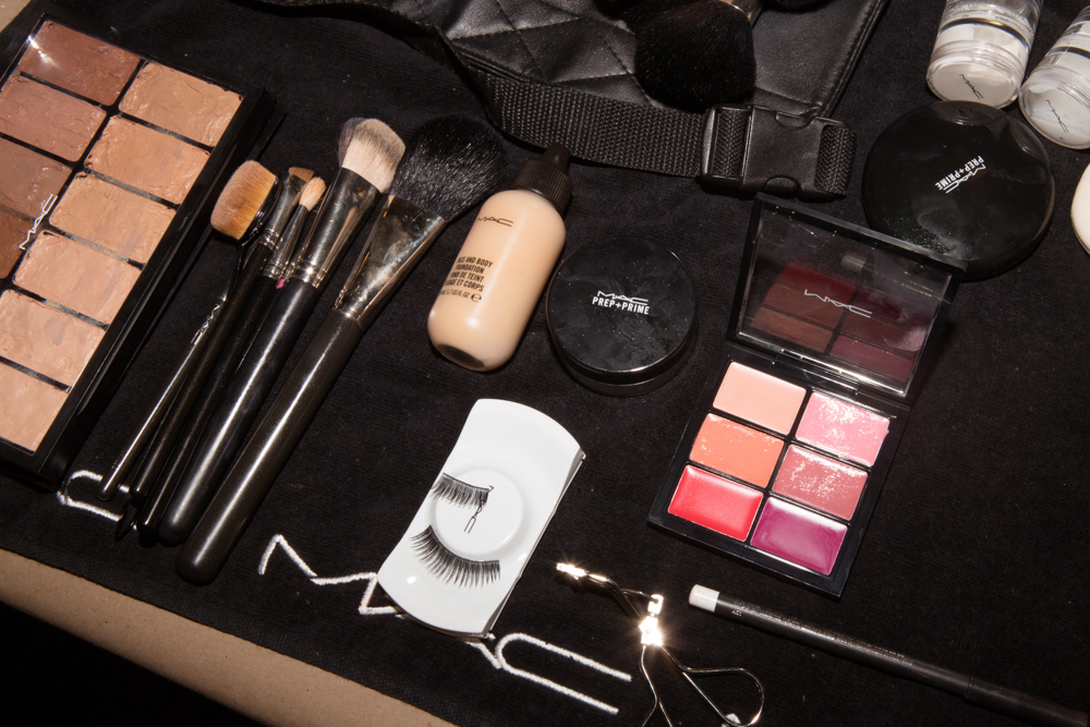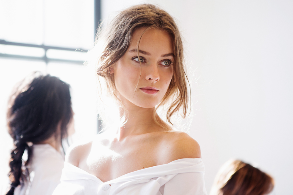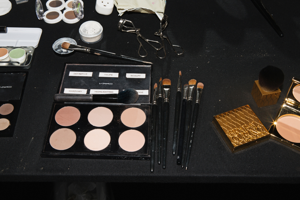 Diane Kendal (Lancôme): “We’re doing really luminous skin and emphasizing the eyes with Le Crayon Khol in Black Coffee mixed with moisturizer and then putting a cream base on top. The eyes have a sultry, sexy wave with curled lashes. We’re dusting the cheeks with a peachy shimmer and countering. We’re filling in eyebrows—just maximizing the girls’ features. It’s really about the skin and enhancing the eyes with a dewy, smoky look. Spring/Summer always tends to have a more natural feel.”