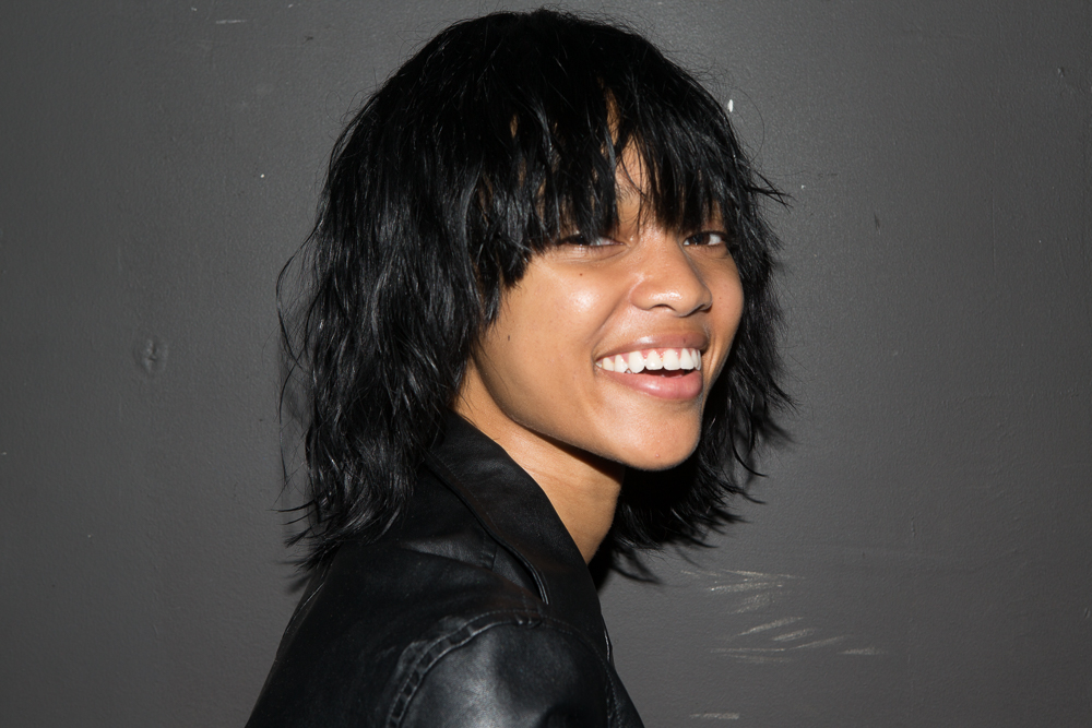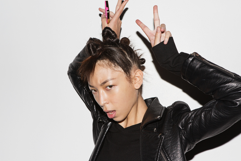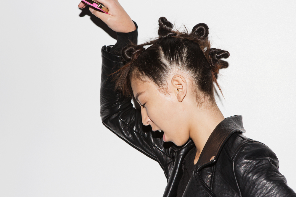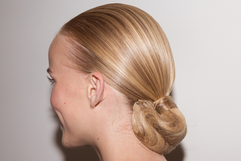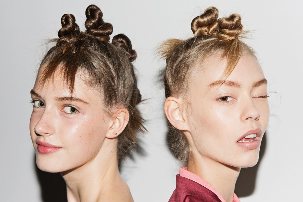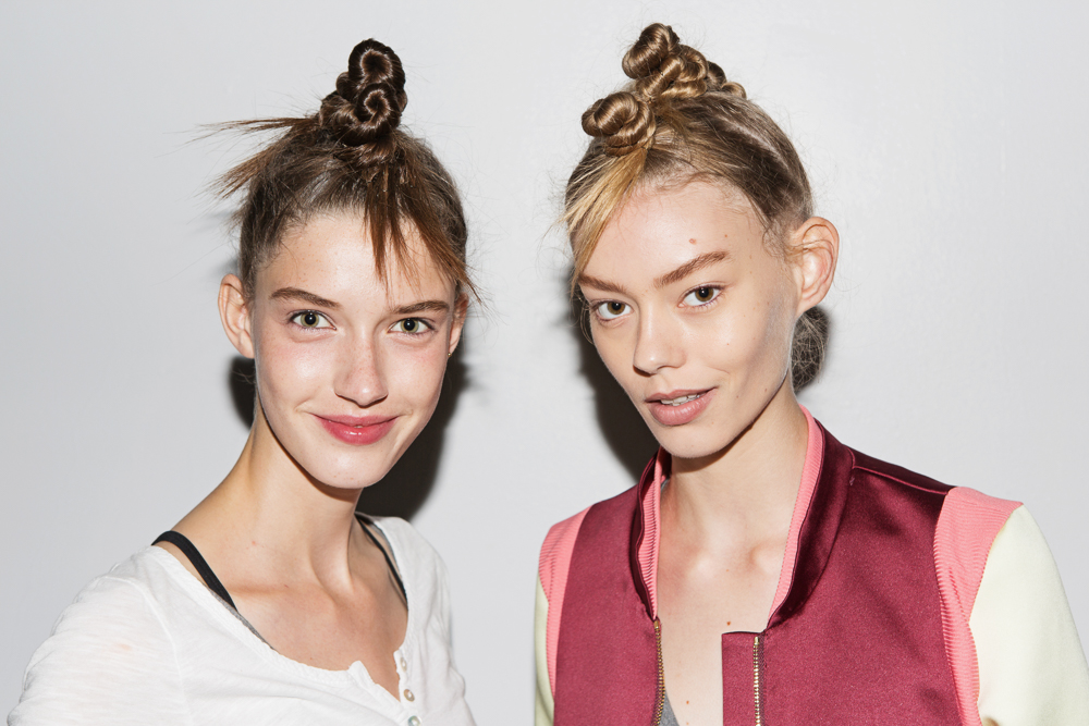 Guido Palau (Redken): “It’s a continuation of last season’s girl, with that punky headband. She’s got the same innocence and cuteness to her, but now she’s going to a rave. She’s into her dance phase and is wearing some Björk-inspired knots. It’s a very easy hairstyle to achieve because you can’t really get it wrong. We take four sections of hair and bring them up to the top of the crown, sort of like a mohawk. Then we twist them down and leave some of the ends out, especially around the hairline so it doesn’t feel too clean or modern. Then we’re finishing it with some fine pins. One thing that you do need is a little bit of texture in the hair to make it much easier to go up into these knots. If your hair is too clean, it’ll slip slide around. So the Redken Wind Blown 05 we’re using are multi-purpose—sometimes you’ll see it being us to create chunky sections of hair and then you’ll see it to achieve these knots. Just before the girls go out, I’m going to be spraying a little bit of Evian to give that slightly sweaty feel, so you feel like they might have been in a nightclub. It’ll help create a softness—like an innocent mistake. It should feel easy.”