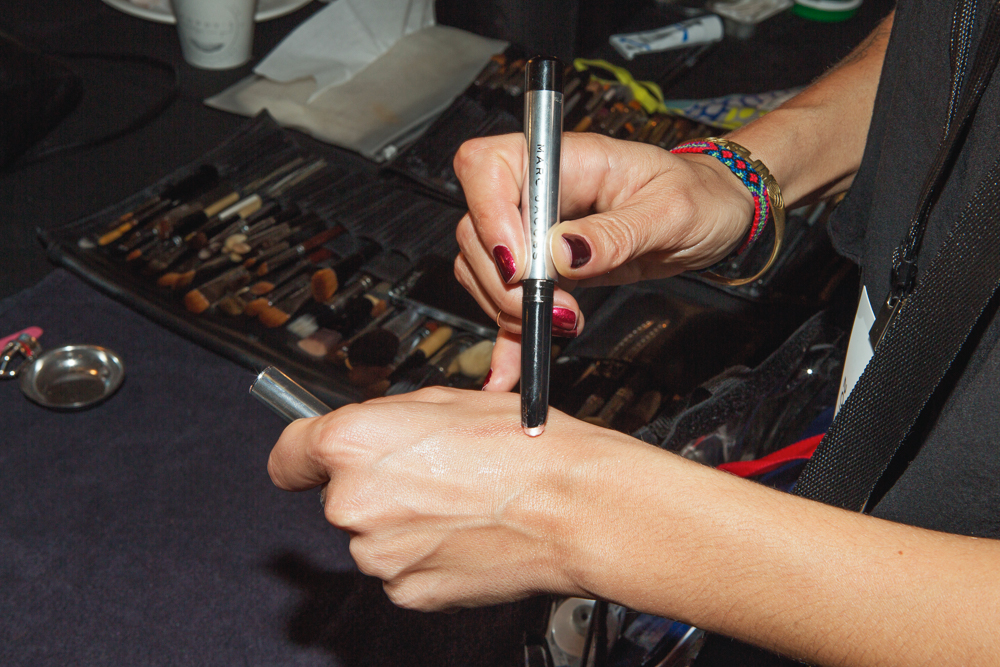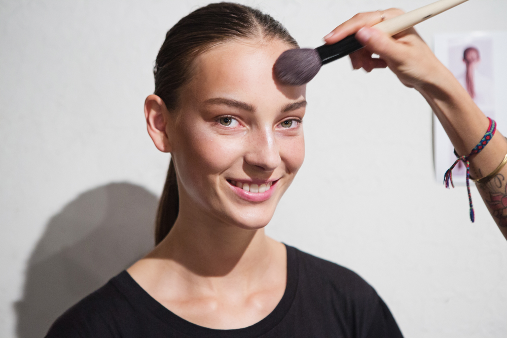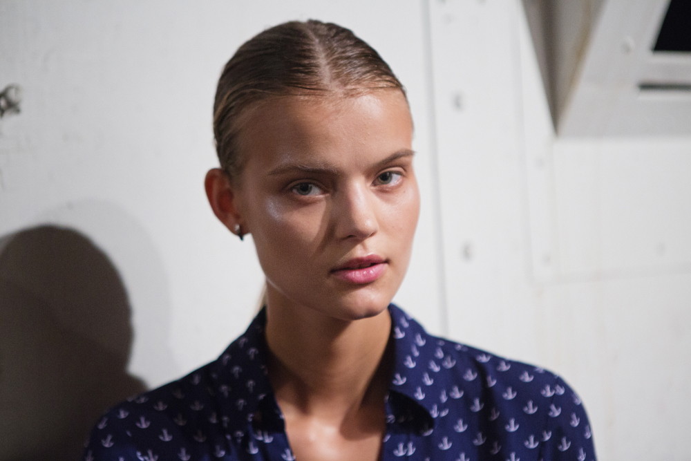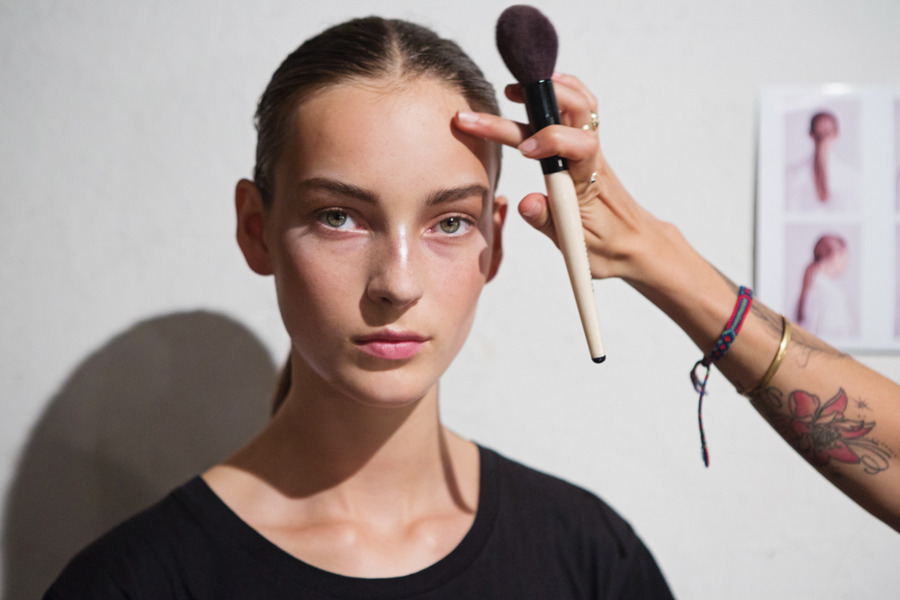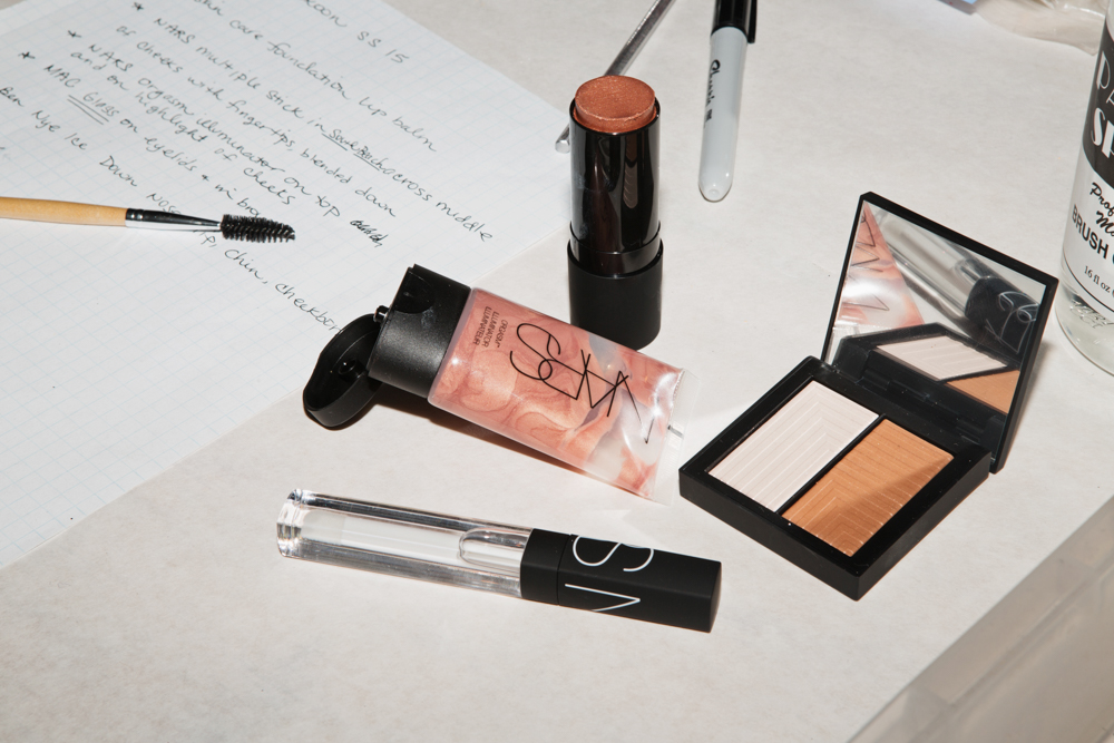Diane Kendal (Nars): “Thakoon wanted the girls to look like they were just coming out of water with the sun reflecting light on their dewy, wet skin. So basically we just moisturized, evened out skin tone and then we’re applying the South Beach Multiple just on the apples of their cheeks with our fingers and spreading across. On top of that, we’re using the Illuminator in Orgasm— it’s got quite a shimmer so it gives a beautiful sheen to the skin. We’re brushing eyebrows up and filling them in with powder and a brush, but not really defining them—just making sure there’s no holes so they look a bit fuller. And there's no mascara or anything. We put some lip gloss on the top of the lid and a bit of lip balm on the lips and that’s it.”