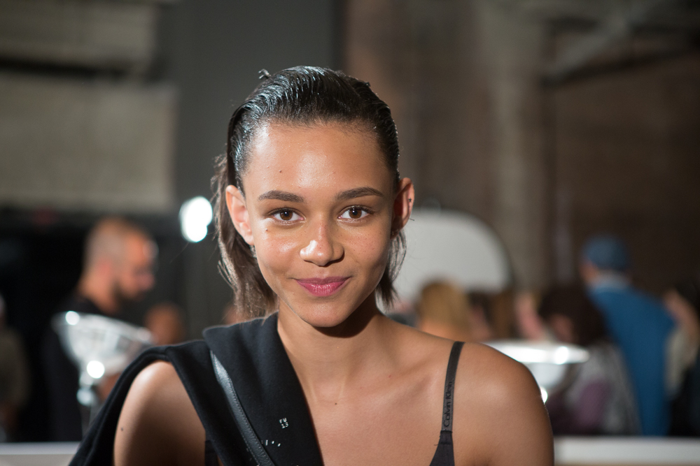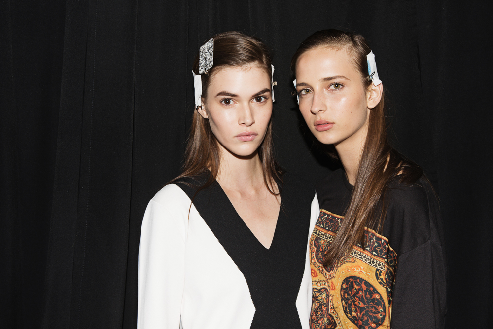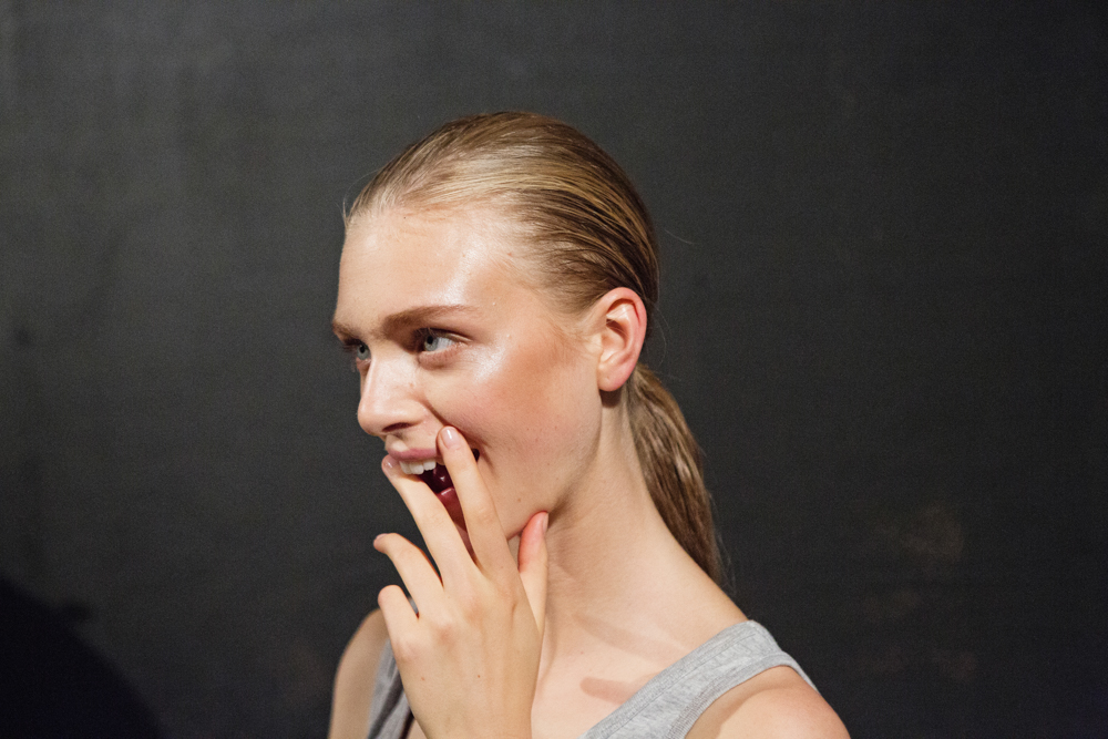 Tom's take: “Super super simple look, very matte and sculpted. Hair in slicked-back ponytails, glossy clear nails, and major contoured cheekbones with a super pearly highlight. There were only three products used. Hair and makeup took like 15 minutes on each girl because it was so minimal. Diane Kendal did the makeup and Paul Hanlon apparently did the hair for Tresemmé but I never saw him.”