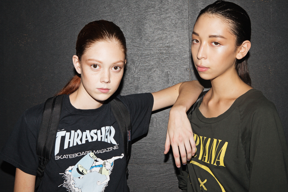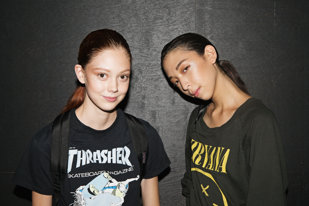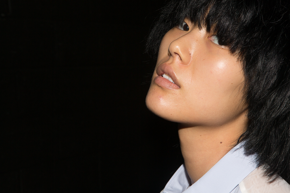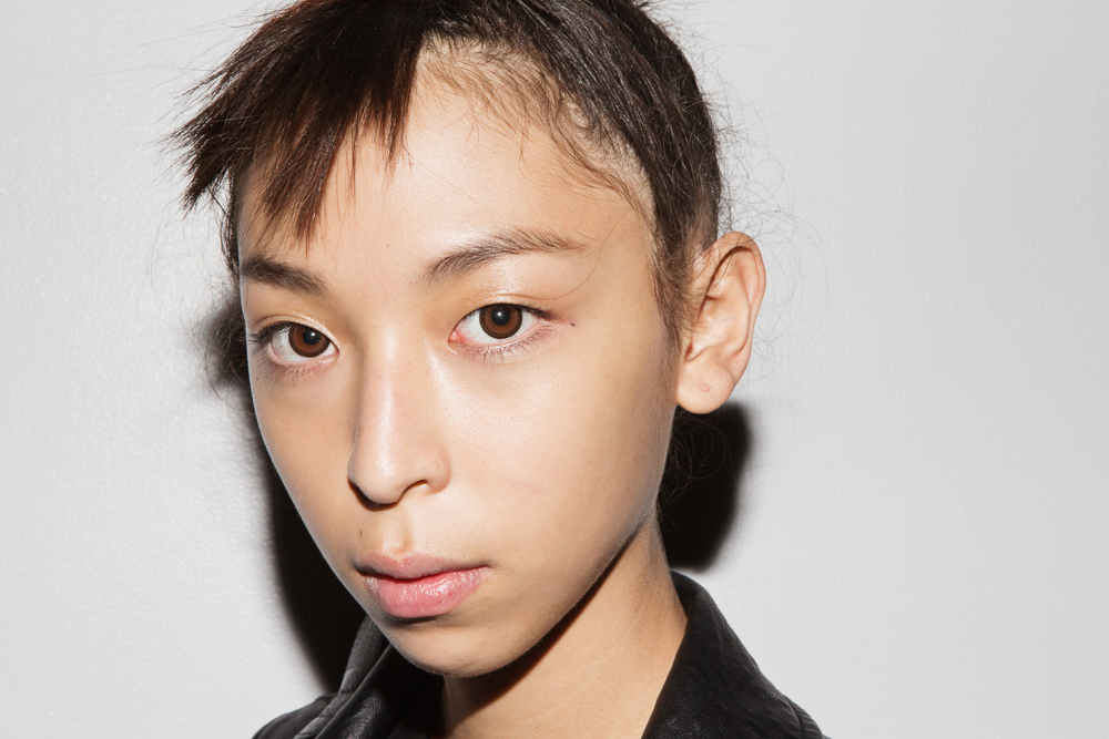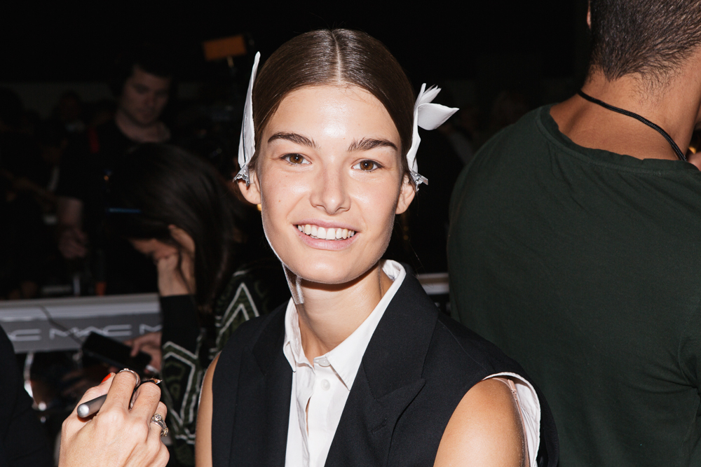 Tom's take: “Hair inspired by Björk, and a no-makeup makeup look that used literally no makeup. The girls just wore some rose lip balm on their lids, cheeks, and lips (the same kind in the white tube with green & red rose vines on it, this or rosebud salve was used EVERYWHERE!) They also used a bit of a gold Marc Jacobs eyeshadow stick on their lids but it was such a subtle gold—why bother? I guess when the hair is as crazy as it was here you don't need a statement-y makeup look. I'd describe how the hair was done but like, who does that benefit? Are there girls out there reading ITG hoping to re-create this? I don't know, maybe they'll say so in the comments and then I'm going to feel bad. It looked like Guido just took pieces of hair in his hands and then twisted and twisted into little buns—the wispy swoops in the front ended up being really cool though. I have the voice memo from Guido. And thank God for Issa Lish! She's let me photograph her at like every show I see her at and is so damn sweet, energetic, and brilliant. Girls like her deserve fancy beauty contracts.”