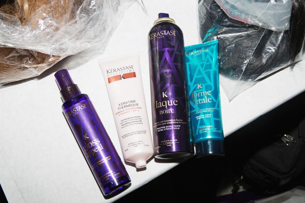 Odile Gilbert (Kérastase): “The inspiration is Charlotte Rampling and Lauren Bacall. We’re setting the hair, doing a side part, and giving it a wave for a retro feel. And we're giving all the girls body and length—so some extensions if the hair's not long enough, mousse at the roots, and combing it out after spraying it with hairspray.”