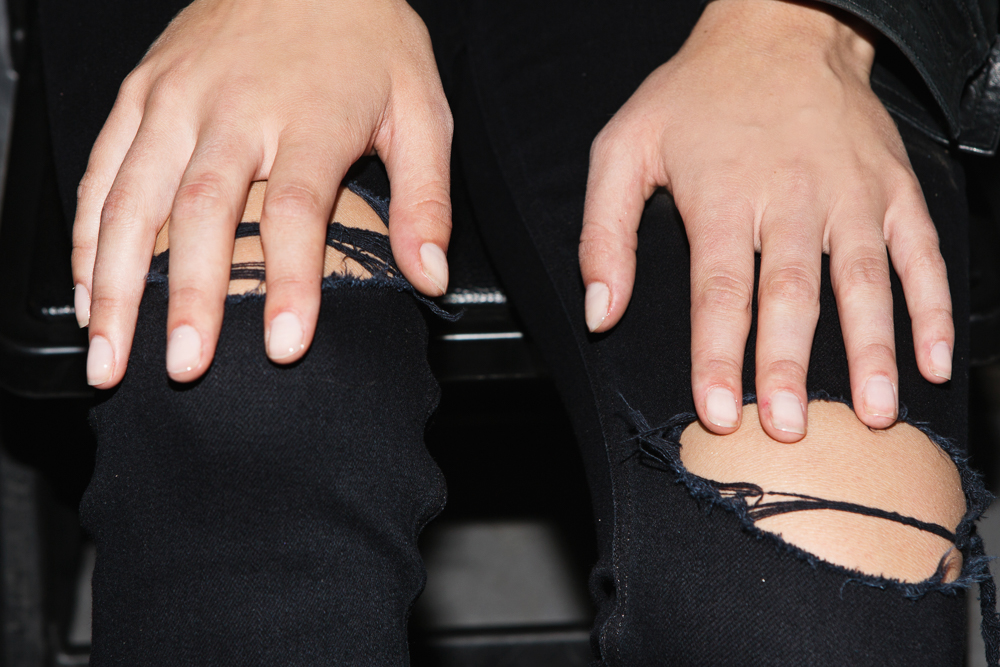 Jin Soon: “We’re going back to basics and tried to give a modern, clean, fresh look on the nails because she’s a downtown, really cool girl and you don’t want to put too much of a high gloss or bright color—it’s sportier this way. But it’s still very groomed and well-done. We put one layer of Jin Soon Power Coat as a base, one coat of Jin Soon Tulle, and one coat of Jin Soon Top Gloss Top Coat. In this case, since the color isn’t super pigmented, you don’t have to use base coat if you’re in a rush. But always use the top coat and you’re good to go. The key about using this kind of color though is you really have to clean under the nails. A lot of people have dirt there, and you’ll see it through the polish.”